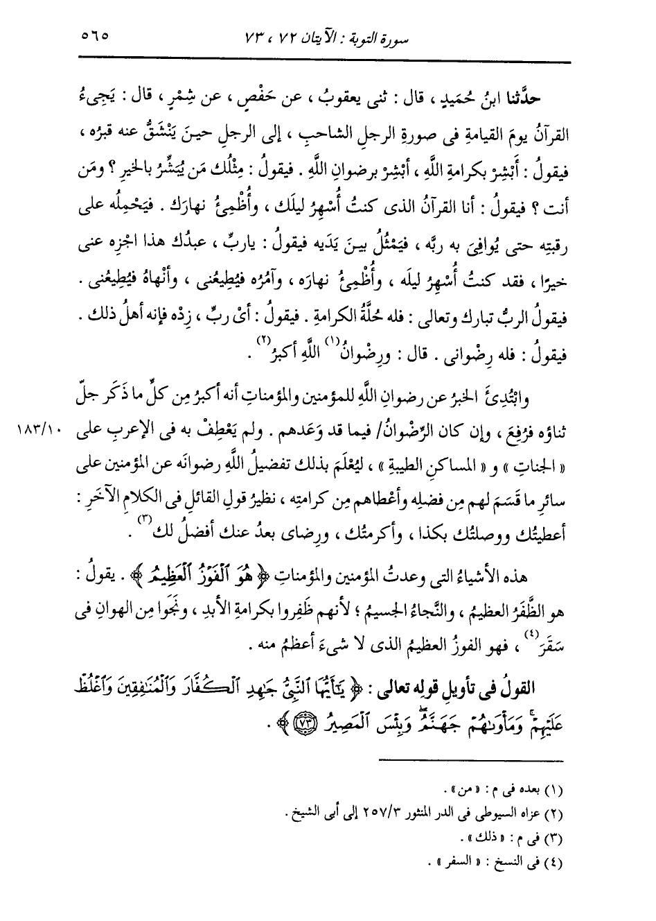 حَدَّثَنَا ابْنُ حُمَيْدٍ، قَالَ: ثني يَعْقُوبُ، عَنْ حَفْصٍ، عَنْ شِمْرٍ، قَالَ: " §يَجِيءُ الْقُرْآنُ يَوْمَ الْقِيَامَةِ فِي صُورَةِ الرَّجُلِ الشَّاحِبِ إِلَى الرَّجُلِ، حِينَ يَنْشَقُّ عَنْهُ قَبْرُهُ، فَيَقُولُ: أَبْشِرْ بِكَرَامَةِ اللَّهِ، أَبْشِرْ بِرِضْوَانِ اللَّهِ، فَيَقُولُ مِثْلُكَ مَنْ يُبَشِّرُ بِالْخَيْرِ، وَمَنْ أَنْتَ؟ فَيَقُولُ: أَنَا الْقُرْآنُ الَّذِي كُنْتُ أُسْهِرُ لَيْلَكَ، وَأُظْمِئُ نَهَارَكَ. فَيَحْمِلُهُ عَلَى رَقَبَتِهِ، حَتَّى يُوَافِيَ بِهِ رَبَّهُ، فَيَمْثُلُ بَيْنَ يَدَيْهِ، فَيَقُولُ: يَا رَبِّ عَبْدُكَ هَذَا اجْزِهِ عَنِّي خَيْرًا، فَقَدْ كُنْتُ أُسْهِرُ لَيْلَهُ، وَأُظْمِئُ نَهَارَهُ، وَآمُرُهُ فَيُطِيعُنِي، وَأَنْهَاهُ فَيُطِيعُنِي، فَيَقُولُ الرَّبُّ تَبَارَكَ وَتَعَالَى: فَلَهُ حُلَّةُ الْكَرَامَةِ، فَيَقُولُ: أَيْ رَبِّ زِدْهُ، فَإِنَّهُ أَهْلُ ذَلِكَ، فَيَقُولُ: فَلَهُ رِضْوَانِي، قَالَ: وَرِضْوَانٌ مِنَ اللَّهِ أَكْبَرُ " وَابْتُدِئَ الْخَبَرُ عَنْ رِضْوَانِ اللَّهِ لِلْمُؤْمِنِينَ وَالْمُؤْمِنَاتِ أَنَّهُ أَكْبَرُ مِنْ كُلِّ مَا ذَكَرَ جَلَّ ثَنَاؤُهُ، فَرُفِعَ، وَإِنْ كَانَ الرِّضْوَانُ فِيمَا قَدْ وَعَدَهُمْ، وَلَمْ يُعْطَفْ بِهِ فِي الْإِعْرَابِ عَلَى الْجَنَّاتِ وَالْمَسَاكِنِ الطَّيِّبَةِ، لِيُعْلَمَ بِذَلِكَ تَفْضِيلُ اللَّهِ رِضْوَانَهُ عَنِ الْمُؤْمِنِينَ عَلَى سَائِرِ مَا قَسَمَ لَهُمْ مِنْ فَضْلِهِ وَأَعْطَاهُمْ مِنْ كَرَامَتِهِ، نَظِيرُ قَوْلِ الْقَائِلِ فِي الْكَلَامِ الْآخَرِ أَعْطَيْتُكَ وَوَصَلْتُكَ بِكَذَا، وَأَكْرَمْتُكَ، وَرِضَايَ بَعْدُ عَنْكَ أَفْضَلُ ذَلِكَ. {ذَلِكَ هُوَ الْفَوْزُ الْعَظِيمُ} [التوبة: 72] هَذِهِ الْأَشْيَاءُ الَّتِي وَعُدْتُ الْمُؤْمِنِينَ وَالْمُؤْمِنَاتِ، هُوَ الْفَوْزُ الْعَظِيمُ، يَقُولُ: هُوَ الظَّفَرُ الْعَظِيمُ وَالنَّجَاءُ الْجَسِيمُ؛ لِأَنَّهُمْ ظَفَرُوا بِكَرَامَةِ الْأَبَدِ، وَنَجَوْا مِنَ الْهَوَانِ فِي السَّفَرِ، فَهُوَ الْفَوْزُ الْعَظِيمُ الَّذِي لَا شَيْءَ أَعْظَمُ مِنْهُ