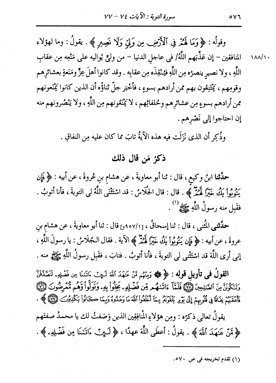 حَدَّثَنِي الْمُثَنَّى، قَالَ: ثنا إِسْحَاقُ، قَالَ: ثنا أَبُو مُعَاوِيَةَ، عَنْ هِشَامِ بْنِ عُرْوَةَ، عَنْ أَبِيهِ: {فَإِنْ يَتُوبُوا يَكُ خَيْرًا لَهُمْ} [التوبة: 74] الْآيَةَ، فَقَالَ الْجُلَاسُ: «يَا رَسُولَ اللَّهِ إِنِّي §أَرَى اللَّهَ قَدِ اسْتَثْنَى لِيَ التَّوْبَةَ، فَأَنَا أَتُوبُ، فَتَابَ، فَقَبِلَ رَسُولُ اللَّهِ صَلَّى اللهُ عَلَيْهِ وَسَلَّمَ مِنْهُ»