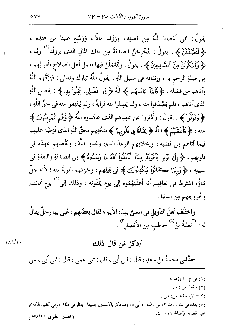 يَقُولُ: لَئِنْ أَعْطَانَا اللَّهُ مِنْ فَضْلِهِ، وَرَزَقَنَا مَالًا، وَوَسَّعَ عَلَيْنَا مِنْ عِنْدِهِ {لَنَصَّدَّقَنَّ} [التوبة: 75] يَقُولُ: لَنُخْرِجَنَّ الصَّدَقَةَ مِنْ ذَلِكَ الْمَالِ الَّذِي رَزَقَنَا رَبُّنَا {وَلَنَكُونَنَّ مِنَ الصَّالِحِينَ} [التوبة: 75] يَقُولُ: وَلَنَعْمَلَنَّ فِيهَا بِعَمَلِ أَهْلِ الصَّلَاحِ بِأَمْوَالِهِمْ مِنْ صِلَةِ الرَّحِمِ بِهِ وَإِنْفَاقِهِ فِي سَبِيلِ اللَّهِ. يَقُولُ اللَّهُ تَبَارَكَ وَتَعَالَى: فَرَزَقَهُمُ اللَّهُ وَآتَاهُمْ مِنْ فَضْلِهِ. {فَلَمَّا آتَاهُمْ} [التوبة: 76] اللَّهُ {مِنْ فَضْلِهِ بَخِلُوا بِهِ} [التوبة: 76] بِفَضْلِ اللَّهِ الذي آتَاهُمْ فَلَمْ يَصَّدَّقُوا مِنْهُ وَلَمْ يَصِلُوا مِنْهُ قَرَابَةً وَلَمْ يُنْفِقُوا مِنْهُ فِي حَقِّ اللَّهِ {وَتَوَلَّوْا} [التوبة: 76] يَقُولُ وَأَدْبَرُوا عَنْ عَهْدِهِمُ الَّذِي عَاهَدُوهُ اللَّهَ {وَهُمْ مُعْرِضُونَ} [آل عمران: 23] عَنْهُ {فَأَعْقَبَهُمْ} [التوبة: 77] اللَّهُ {نِفَاقًا فِي قُلُوبِهِمْ} [التوبة: 77] بِبُخْلِهِمْ بِحَقِّ اللَّهِ الَّذِي فَرَضَهُ عَلَيْهِمْ فِيمَا آتَاهُمْ مِنْ فَضْلِهِ وَإِخْلَافِهِمُ الْوَعْدَ الَّذِي وَعَدُوا اللَّهَ وَنَقْضِهِمْ عَهْدَهُ فِي قُلُوبِهِمْ {إِلَى يَوْمِ يَلْقَوْنَهُ بِمَا أَخْلَفُوا اللَّهَ مَا وَعَدُوهُ} [التوبة: 77] مِنَ الصَّدَقَةِ وَالنَّفَقَةِ فِي سَبِيلِهِ {وَبِمَا كَانُوا يَكْذِبُونَ} [التوبة: 77] فِي قِيلِهِمْ وَحَرَمَهُمُ التَّوْبَةَ مِنْهُ لِأَنَّهُ جَلَّ ثَنَاؤُهُ اشْتَرَطَ فِي نِفَاقِهِمْ أَنَّهُ أَعْقَبَهُمُوهُ {إِلَى يَوْمِ يَلْقَوْنَهُ} [التوبة: 77] وَذَلِكَ يَوْمُ مَمَاتِهِمْ وَخُرُوجِهِمْ مِنَ الدُّنْيَا. وَاخْتَلَفَ أَهْلُ التَّأْوِيلِ فِي الْمَعْنِيِّ بِهَذِهِ الْآيَةِ، فَقَالَ بَعْضُهُمْ: عُنِيَ بِهَا رَجُلٌ يُقَالُ لَهُ ثَعْلَبَةُ بْنُ حَاطِبٍ مِنَ الْأَنْصَارِ