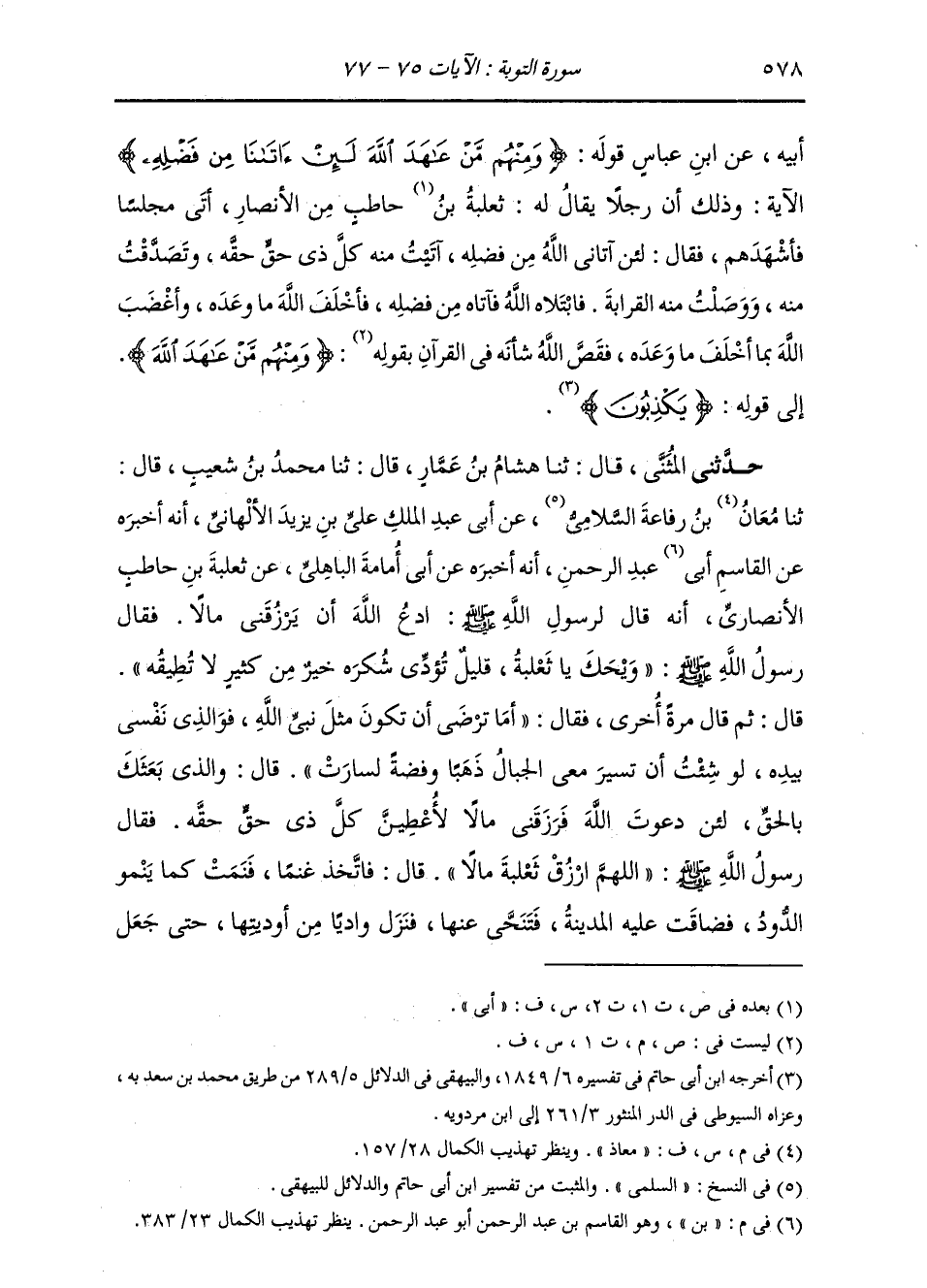حَدَّثَنِي الْمُثَنَّى، قَالَ: ثنا هِشَامُ بْنُ عَمَّارٍ، قَالَ: ثنا مُحَمَّدُ بْنُ شُعَيْبٍ، قَالَ: ثنا مُعَاذُ بْنُ رِفَاعَةَ السُّلَمِيُّ، عَنْ أَبِي عَبْدِ الْمَلِكِ عَلِيِّ بْنِ يَزِيدَ الْأَلْهَانِيِّ، أَنَّهُ أَخْبَرَهُ عَنِ الْقَاسِمِ بْنِ عَبْدِ الرَّحْمَنِ، أَنَّهُ أَخْبَرَهُ عَنْ أَبِي أُمَامَةَ الْبَاهِلِيِّ، عَنْ ثَعْلَبَةَ بْنِ حَاطِبٍ الْأَنْصَارِيِّ، أَنَّهُ قَالَ لِرَسُولِ اللَّهِ صَلَّى اللهُ عَلَيْهِ وَسَلَّمَ: ادْعُ اللَّهَ أَنْ يَرْزُقَنِيَ مَالًا، فَقَالَ رَسُولُ اللَّهِ صَلَّى اللهُ عَلَيْهِ وَسَلَّمَ: «وَيْحَكَ يَا ثَعْلَبَةُ، §قَلِيلٌ تُؤَدِّي شُكْرَهُ، خَيْرٌ مِنْ كَثِيرٍ لَا تُطِيقُهُ» قَالَ: ثُمَّ قَالَ مَرَّةً أُخْرَى، فَقَالَ: «أَمَا تَرْضَى أَنْ تَكُونَ مِثْلَ نَبِيِّ اللَّهِ؟ فَوَالَّذِي نَفْسِي بِيَدِهِ لَوْ شِئْتُ أَنْ تَسِيرَ مَعِيَ الْجِبَالُ ذَهَبًا وَفِضَّةً لَسَارَتْ» قَالَ: وَالَّذِي بَعَثَكَ بِالْحَقِّ، لَئِنْ دَعَوْتَ اللَّهَ فَرَزَقَنِي مَالًا لَأُعْطِيَنَّ كُلَّ ذِي حَقٍّ حَقَّهُ، فَقَالَ رَسُولُ اللَّهِ صَلَّى اللهُ عَلَيْهِ وَسَلَّمَ: «اللَّهُمَّ ارْزُقْ ثَعْلَبَةَ مَالًا» . قَالَ: فَاتَّخَذَ غَنَمًا، فَنَمَتْ كَمَا يَنْمُو الدُّودُ، فَضَاقَتْ عَلَيْهِ الْمَدِينَةُ فَتَنَحَّى عَنْهَا، فَنَزَلَ وَادِيًا مِنْ أَوْدِيَتِهَا، حَتَّى جَعَلَ -[579]- يُصَلِّي الظُّهْرَ وَالْعَصْرَ فِي جَمَاعَةٍ، وَيَتْرُكَ مَا سِوَاهُمَا. ثُمَّ نَمَتْ وَكَثُرَتْ، فَتَنَحَّى حَتَّى تَرَكَ الصَّلَوَاتِ إِلَّا الْجُمُعَةَ، وَهِيَ تَنْمُو كَمَا يَنْمُو الدُّودُ، حَتَّى تَرَكَ الْجُمُعَةَ. فَطَفِقَ يُتَلَقَّى الرُّكْبَانَ يَوْمَ الْجُمُعَةِ يَسْأَلُهُمْ عَنِ الْأَخْبَارِ فَقَالَ رَسُولُ اللَّهِ صَلَّى اللهُ عَلَيْهِ وَسَلَّمَ: «مَا فَعَلَ ثَعْلَبَةُ؟» فَقَالُوا: يَا رَسُولَ اللَّهِ اتَّخَذَ غَنَمًا فَضَاقَتْ عَلَيْهِ الْمَدِينَةُ، فَأَخْبَرُوهُ بِأَمْرِهِ، فَقَالَ: «يَا وَيْحَ ثَعْلَبَةَ، يَا وَيْحَ ثَعْلَبَةَ، يَا وَيْحَ ثَعْلَبَةَ» قَالَ: وَأَنْزَلَ اللَّهُ: {خُذْ مِنْ أَمْوَالِهِمْ صَدَقَةً} [التوبة: 103] الْآيَةَ. وَنَزَلَتْ عَلَيْهِ فَرَائِضُ الصَّدَقَةِ، فَبَعَثَ رَسُولُ اللَّهِ صَلَّى اللهُ عَلَيْهِ وَسَلَّمَ رَجُلَيْنِ عَلَى الصَّدَقَةِ، رَجُلًا مِنْ جُهَيْنَةَ، وَرَجُلًا مِنْ سُلَيْمٍ، وَكَتَبَ لَهُمَا كَيْفَ يَأْخُذَانِ الصَّدَقَةَ مِنَ الْمُسْلِمِينَ، وَقَالَ لَهُمَا: «مُرَّا بِثَعْلَبَةَ، وَبِفُلَانٍ رَجُلٍ مِنْ بَنِي سُلَيْمٍ فَخُذَا صَدَقَاتِهِمَا» فَخَرَجَا حَتَّى أَتَيَا ثَعْلَبَةَ، فَسَأَلَاهُ الصَّدَقَةَ، وَأَقْرَأَاهُ كِتَابَ رَسُولِ اللَّهِ صَلَّى اللهُ عَلَيْهِ وَسَلَّمَ، فَقَالَ: مَا هَذِهِ إِلَّا جِزْيَةٌ، مَا هَذِهِ إِلَّا أُخْتُ الْجِزْيَةِ، مَا أَدْرِي مَا هَذَا، انْطَلِقَا حَتَّى تَفْرُغَا ثُمَّ عُودَا إِلَيَّ، فَانْطَلَقَا، وَسَمِعَ بِهِمَا السُّلَمِيُّ، فَنَظَرَ إِلَى خِيَارِ أَسْنَانِ إِبِلِهِ فَعَزَلَهَا لِلصَّدَقَةِ ثُمَّ اسْتَقْبَلَهُمْ بِهَا، فَلَمَّا رَأَوْهَا، قَالُوا: مَا يَجِبُ عَلَيْكَ هَذَا، وَمَا نُرِيدُ أَنْ نَأْخُذَ هَذَا مِنْكَ. قَالَ: بَلَى فَخُذُوهُ، فَإِنَّ نَفْسِي بِذَلِكَ طَيِّبَةٌ، وَإِنَّمَا هِيَ لِي فَأَخَذُوهَا مِنْهُ. فَلَمَّا فَرَغَا مِنْ صَدَقَاتِهِمَا رَجَعَا، حَتَّى مَرَّا بِثَعْلَبَةَ، فَقَالَ: أَرُونِي كِتَابَكُمَا، فَنَظَرَ فِيهِ فَقَالَ: مَا هَذِهِ إِلَّا أُخْتُ الْجِزْيَةِ، انْطَلِقَا حَتَّى أَرَى رَأْيِي. فَانْطَلَقَا حَتَّى أَتَيَا النَّبِيَّ صَلَّى اللهُ عَلَيْهِ وَسَلَّمَ، فَلَمَّا رَآهُمَا قَالَ: «يَا وَيْحَ ثَعْلَبَةَ» قَبْلَ أَنْ يُكَلِّمَهُمَا، وَدَعَا لِلسُّلَمِ