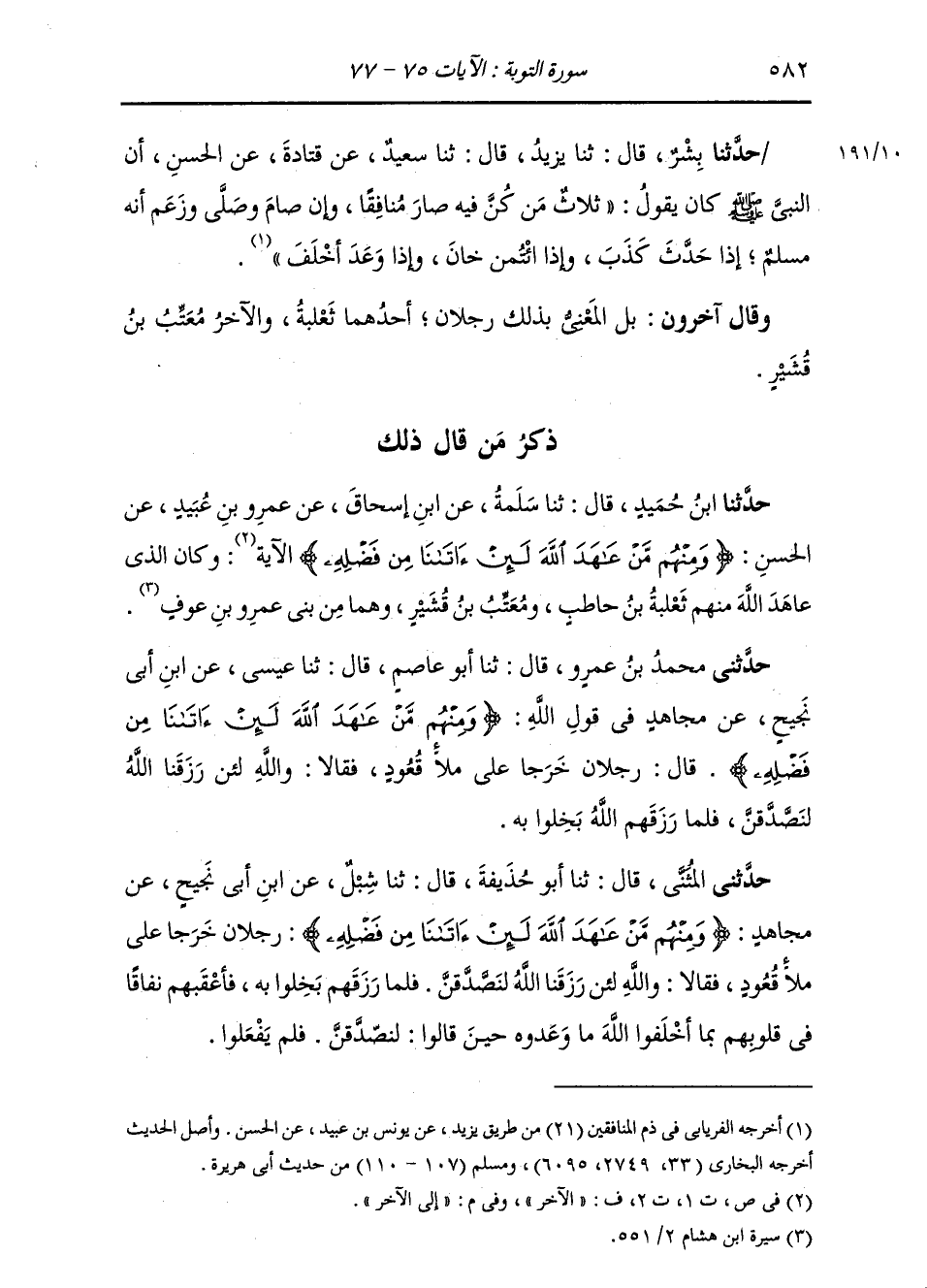 حَدَّثَنِي الْمُثَنَّى، قَالَ: ثنا أَبُو حُذَيْفَةَ، قَالَ: ثنا شِبْلٌ، عَنِ ابْنِ أَبَى نَجِيحٍ، عَنْ مُجَاهِدٍ، " {§وَمِنْهُمْ مَنْ عَاهَدَ اللَّهَ لَئِنْ آتَانَا مِنْ فَضْلِهِ} [التوبة: 75] رَجُلَانِ خَرَجَا عَلَى مَلَإٍ قُعُودٍ، فَقَالَا: وَاللَّهِ لَئِنْ رَزَقَنَا اللَّهُ لَنَصَّدَّقَنَّ، فَلَمَّا رَزَقَهُمْ بَخِلُوا بِهِ، فَأَعْقَبَهُمْ نِفَاقًا فِي قُلُوبِهِمْ بِمَا أَخْلَفُوا اللَّهَ مَا وَعَدُوهُ حِينَ قَالُوا: لَنَصَّدَّقَنَّ، فَلَمْ يَفْعَلُوا ". -[583]- حَدَّثَنِي الْمُثَنَّى، قَالَ: ثنا إِسْحَاقُ، قَالَ: ثنا عَبْدُ اللَّهِ، عَنْ وَرْقَاءَ، عَنِ ابْنِ أَبِي نَجِيحٍ، عَنْ مُجَاهِدٍ نَحْوَهُ