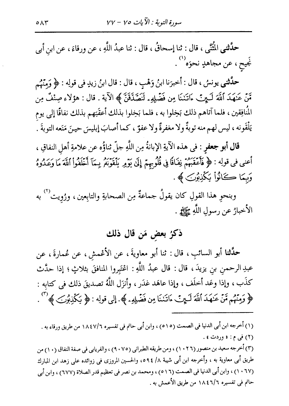 ذِكْرُ مَنْ قَالَ ذَلِكَ: حَدَّثَنَا أَبُو السَّائِبِ، قَالَ: ثنا أَبُو مُعَاوِيَةَ، عَنِ الْأَعْمَشِ، عَنْ عُمَارَةَ، عَنْ عَبْدِ الرَّحْمَنِ بْنِ يَزِيدَ، قَالَ: قَالَ عَبْدُ اللَّهِ: " §اعْتَبِرُوا الْمُنَافِقَ بِثَلَاثٍ: إِذَا حَدَّثَ كَذَبَ، وَإِذَا وَعَدَ أَخْلَفَ، وَإِذَا عَاهَدَ غَدَرَ. وَأَنْزَلَ اللَّهُ تَصْدِيقَ ذَلِكَ فِي كِتَابِهِ: {وَمِنْهُمْ مَنْ عَاهَدَ اللَّهَ لَئِنْ آتَانَا مِنْ فَضْلِهِ} [التوبة: 75] إِلَى قَوْلِهِ: {يَكْذِبُونَ} [التوبة: 77] "