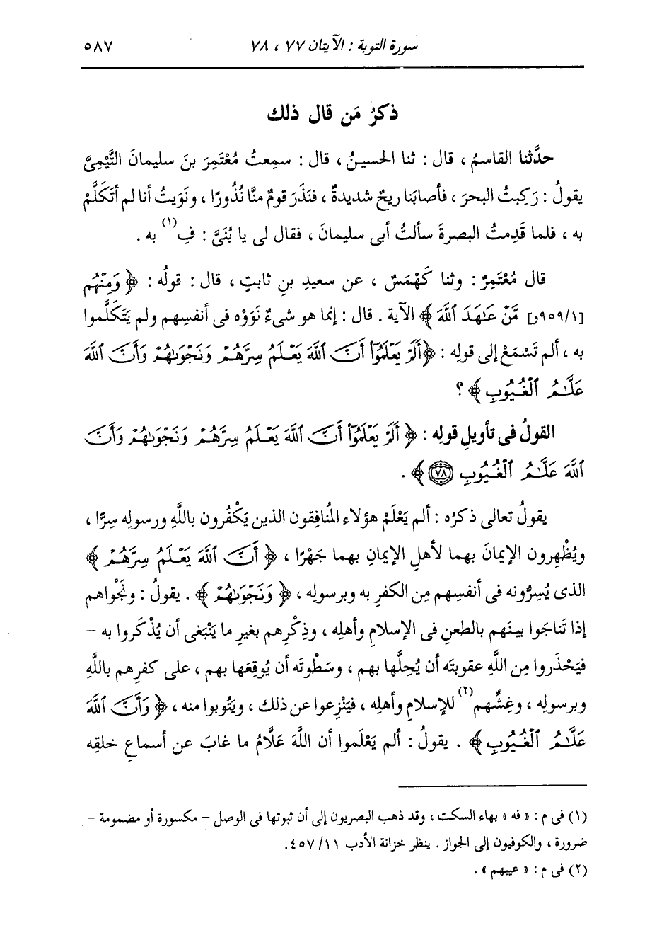 قَالَ مُعْتَمِرٌ، وَثَنًا كَهْمَسٌ، عَنْ سَعِيدِ بْنِ ثَابِتٍ، قَالَ: قَوْلُهُ: " {§وَمِنْهُمْ مَنْ عَاهَدَ اللَّهَ} [التوبة: 75] الْآيَةَ، قَالَ: إِنَّمَا هُوَ شَيْءٌ نَوَوْهُ فِي أَنْفُسِهِمْ وَلَمْ يَتَكَلَّمُوا بِهِ، أَلَمْ تَسْمَعْ إِلَى قَوْلِهِ: {أَلَمْ يَعْلَمُوا أَنَّ اللَّهَ يَعْلَمُ سِرَّهُمْ وَنَجْوَاهُمْ وَأَنَّ اللَّهَ عَلَّامُ الْغُيُوبِ} [التوبة: 78] "