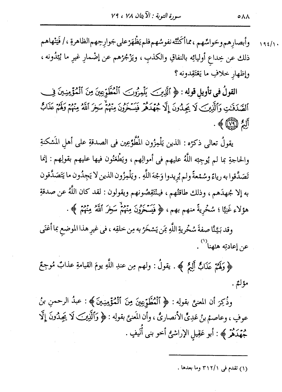 §الْقَوْلُ فِي تَأْوِيلِ قَوْلِهِ تَعَالَى: {الَّذِينَ يَلْمِزُونَ الْمُطَّوِّعِينَ مِنَ الْمُؤْمِنِينَ فِي الصَّدَقَاتِ وَالَّذِينَ لَا يَجِدُونَ إِلَّا جُهْدَهُمْ فَيَسْخَرُونَ مِنْهُمْ سَخِرَ اللَّهُ مِنْهُمْ وَلَهُمْ عَذَابٌ أَلِيمٌ} [التوبة: 79] يَقُولُ تَعَالَى ذِكْرُهُ: الَّذِينَ يَلْمِزُونَ الْمُطَّوِّعِينَ فِي الصَّدَقَةِ عَلَى أَهْلِ الْمَسْكَنَةِ وَالْحَاجَةِ، بِمَا لَمْ يُوجِبْهُ اللَّهُ عَلَيْهِمْ فِي أَمْوَالِهِمْ، وَيَطْعَنُونَ فِيهَا عَلَيْهِمْ بِقَوْلِهِمْ: إِنَّمَا تَصَدَّقُوا بِهِ رِيَاءً وَسُمْعَةً، وَلَمْ يُرِيدُوا وَجْهَ اللَّهِ، وَيَلْمِزُونَ الَّذِينَ لَا يَجِدُونَ مَا يَتَصَدَّقُونَ بِهِ إِلَّا جُهْدَهُمْ، وَذَلِكَ طَاقَتَهُمْ، فَيَنْتَقِصُونَهُمْ وَيَقُولُونَ: لَقَدْ كَانَ اللَّهُ عَنْ صَدَقَةِ هَؤُلَاءِ غَنِيًّا، سُخْرِيَةً مِنْهُمْ بِهِمْ. {فَيَسْخَرُونَ مِنْهُمْ سَخِرَ اللَّهُ مِنْهُمْ} [التوبة: 79] وَقَدْ بَيَّنَّا صِفَةَ سُخْرِيَةِ اللَّهِ بِمَنْ يَسْخَرُ بِهِ مِنْ خَلْقِهِ فِي غَيْرِ هَذَا الْمَوْضِعِ بِمَا أَغْنَى عَنْ إِعَادَتِهِ هَاهُنَا. {وَلَهُمْ عَذَابٌ أَلِيمٌ} [البقرة: 10] يَقُولُ: وَلَهُمْ مِنْ عِنْدِ اللَّهِ يَوْمَ الْقِيَامَةِ عَذَابٌ مُوجِعٌ مُؤْلِمٌ. وَذُكِرَ أَنَّ الْمَعْنِيَّ بِقَوْلِهِ: {الْمُطَّوِّعِينَ مِنَ الْمُؤْمِنِينَ} [التوبة: 79] عَبْدُ الرَّحْمَنِ بْنُ عَوْفٍ، وَعَاصِمُ بْنُ عَدِيٍّ الْأَنْصَارِيُّ. وَأَنَّ الْمَعْنِيَّ بِقَوْلِهِ: {وَالَّذِينَ لَا يَجِدُونَ إِلَّا جُهْدَهُمْ} [التوبة: 79] أَبُو عَقِيلٍ الْأَرَاشِيُّ أَخُو بَنِي أُنَيْفٍ
