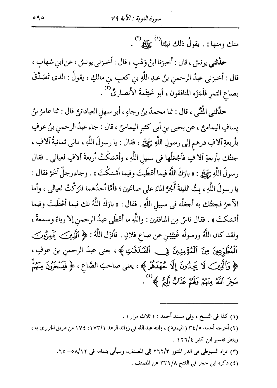 حَدَّثَنِي الْمُثَنَّى، قَالَ: ثنا مُحَمَّدُ بْنُ رَجَاءَ أَبُو سَهْلٍ الْعَبَّادَانِيُّ، قَالَ: ثنا عَامِرُ بْنُ يَسَافٍ الْيَمَامِيُّ، عَنْ يَحْيَى بْنِ أَبِي كَثِيرٍ الْيَمَامِيِّ، قَالَ: جَاءَ عَبْدُ الرَّحْمَنِ بْنُ عَوْفٍ بِأَرْبَعَةِ آلَافِ دِرْهَمٍ إِلَى رَسُولِ اللَّهِ صَلَّى اللهُ عَلَيْهِ وَسَلَّمَ فَقَالَ: يَا رَسُولَ اللَّهِ مَالِي ثَمَانِيَةُ آلَافٍ، جِئْتُكَ بِأَرْبَعَةِ آلَافٍ فَاجْعَلْهَا فِي سَبِيلِ اللَّهِ، وَأَمْسَكْتُ أَرْبَعَةَ آلَافٍ لِعِيَالِي، فَقَالَ رَسُولُ اللَّهِ صَلَّى اللهُ عَلَيْهِ وَسَلَّمَ: «§بَارَكَ اللَّهُ فِيمَا أَعْطَيْتَ وَفِيمَا أَمْسَكْتَ» وَجَاءَ رَجُلٌ آخَرُ فَقَالَ: يَا رَسُولَ اللَّهِ، بِتُّ اللَّيْلَةَ أَجُرُّ الْمَاءَ عَلَى صَاعَيْنِ، فَأَمَّا أَحَدُهُمَا فَتَرَكْتُ لِعِيَالِي، وَأَمَّا الْآخَرُ فَجِئْتُكَ بِهِ، اجْعَلْهُ فِي سَبِيلِ اللَّهِ، فَقَالَ: «بَارَكَ اللَّهُ فِيمَا أَعْطَيْتَ وَفِيمَا أَمْسَكْتَ» فَقَالَ نَاسٌ مِنَ الْمُنَافِقِينَ: وَاللَّهِ مَا أَعْطَى عَبْدُ الرَّحْمَنِ إِلَّا رِيَاءً وَسُمْعَةً، وَلَقَدْ كَانَ اللَّهُ وَرَسُولُهُ غَنِيَّيْنِ عَنْ صَاعِ فُلَانٍ، فَأَنْزَلَ اللَّهُ: {الَّذِينَ يَلْمِزُونَ الْمُطَّوِّعِينَ مِنَ الْمُؤْمِنِينَ فِي الصَّدَقَاتِ} [التوبة: 79] يَعْنِي عَبْدَ الرَّحْمَنِ بْنَ عَوْفٍ {وَالَّذِينَ لَا يَجِدُونَ إِلَّا جُهْدَهُمْ} [التوبة: 79] يَعْنِي صَاحِبَ الصَّاعِ {فَيَسْخَرُونَ مِنْهُمْ سَخِرَ اللَّهُ مِنْهُمْ وَلَهُمْ عَذَابٌ أَلِيمٌ} [التوبة: 79]