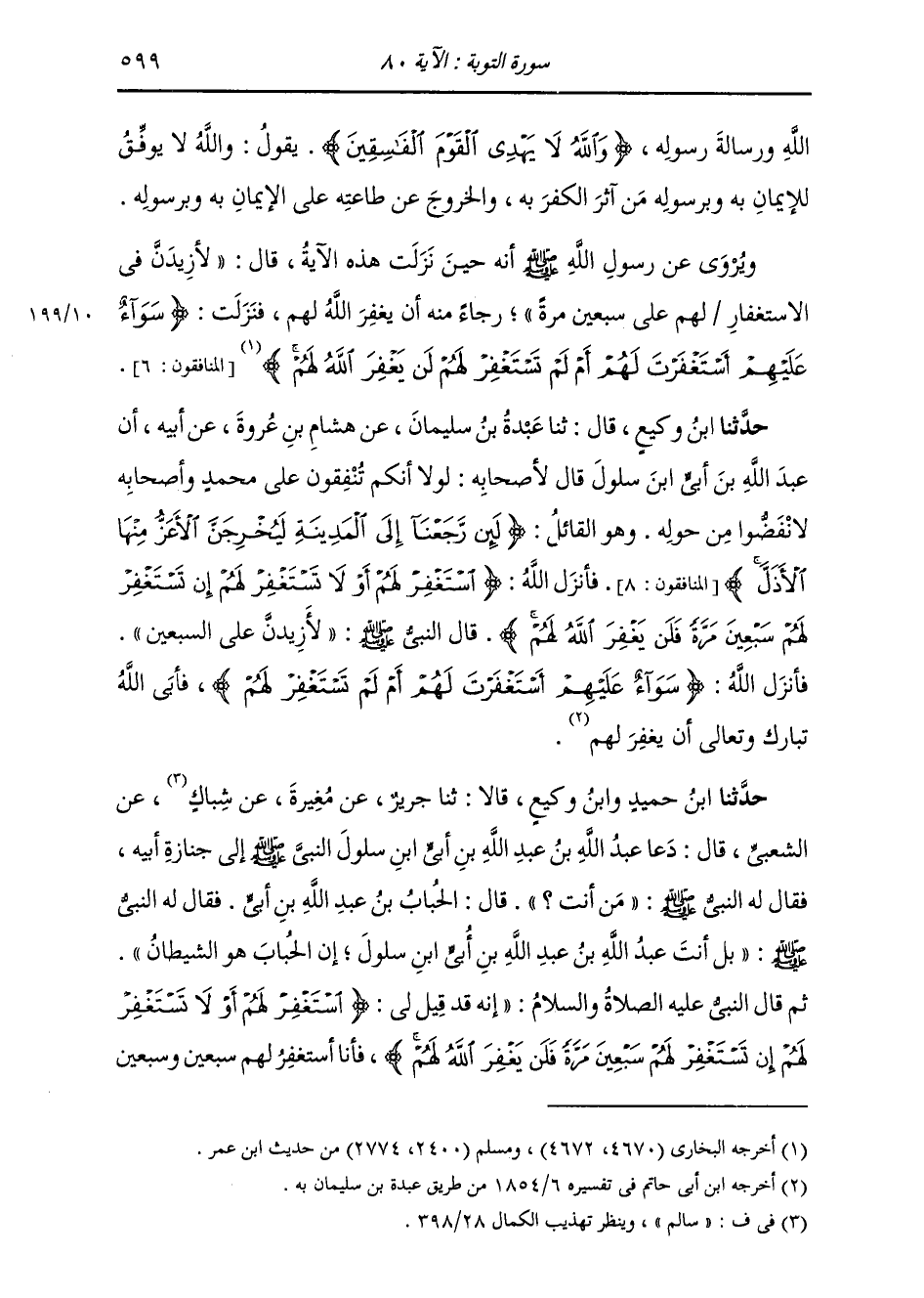 حَدَّثَنَا ابْنُ وَكِيعٍ، قَالَ: ثنا عَبْدَةُ بْنُ سُلَيْمَانَ، عَنْ هِشَامِ بْنِ عُرْوَةَ، عَنْ أَبِيهِ، أَنَّ عَبْدَ اللَّهِ بْنَ أُبَيٍّ ابْنَ سَلُولَ، قَالَ لِأَصْحَابِهِ: لَوْلَا أَنَّكُمْ تُنْفِقُونَ عَلَى مُحَمَّدٍ وَأَصْحَابِهِ لَانْفَضُّوا مِنْ حَوْلِهِ. وَهُوَ الْقَائِلُ: {لَئِنْ رَجَعْنَا إِلَى الْمَدِينَةِ لَيُخْرِجَنَّ الْأَعَزُّ مِنْهَا الْأَذَلَّ} [المنافقون: 8] فَأَنْزَلَ اللَّهُ: {§اسْتَغْفِرْ لَهُمْ أَوْ لَا تَسْتَغْفِرْ لَهُمْ إِنْ تَسْتَغْفِرْ لَهُمْ سَبْعِينَ مَرَّةً فَلَنْ يَغْفِرَ اللَّهُ لَهُمْ} [التوبة: 80] قَالَ النَّبِيُّ صَلَّى اللهُ عَلَيْهِ وَسَلَّمَ: «لَأَزِيدَنَّ عَلَى السَّبْعِينَ» فَأَنْزَلَ اللَّهُ: {سَوَاءٌ عَلَيْهِمْ أَسْتَغْفَرْتَ لَهُمْ أَمْ لَمْ تَسْتَغْفِرْ لَهُمْ} [المنافقون: 6] فَأَبَى اللَّهُ تَبَارَكَ وَتَعَالَى أَنْ يَغْفِرَ لَهُمْ