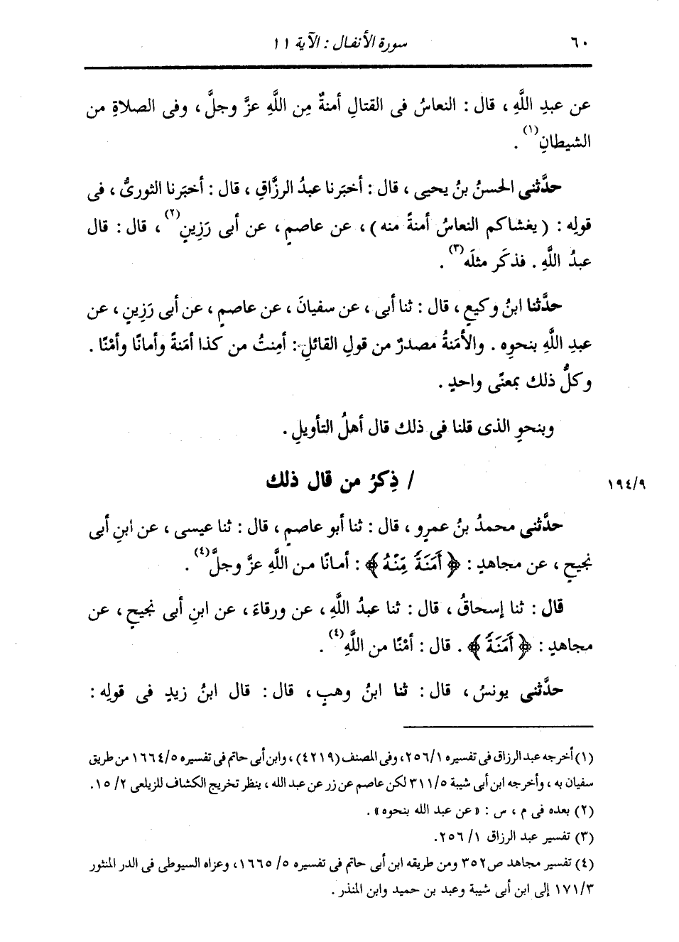 قَالَ: ثنا إِسْحَاقُ قَالَ: ثنا عَبْدُ اللَّهِ عَنْ وَرْقَاءَ، عَنِ ابْنِ أَبِي نَجِيحٍ، عَنْ مُجَاهِدٍ: {أَمَنَةً} [الأنفال: 11] قَالَ: «§أَمْنًا مِنَ اللَّهِ»