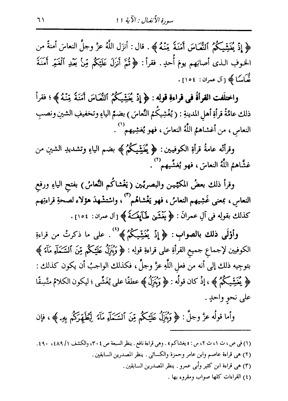 : " {§إِذْ يُغَشِّيكُمُ النُّعَاسَ أَمَنَةً مِنْهُ} [الأنفال: 11] قَالَ: أَنْزَلَ اللَّهُ عَزَّ وَجَلَّ النُّعَاسَ أَمَنَةً مِنَ الْخَوْفِ الَّذِي أَصَابَهُمْ يَوْمَ أُحُدٍ. فَقَرَأَ: {ثُمَّ أَنْزَلَ عَلَيْكُمْ مِنْ بَعْدِ الْغَمِّ أَمَنَةً نُعَاسًا} [آل عمران: 154] " وَاخْتَلَفَتِ الْقُرَّاءُ فِي قِرَاءَةِ قَوْلِهِ: (إِذْ يَغْشَاكُمُ النُّعَاسُ أَمَنَةً مِنْهُ) فَقَرَأَ ذَلِكَ عَامَّةُ قُرَّاءِ أَهْلِ الْمَدِينَةِ (يُغْشِيكُمُ النُّعَاسَ) بِضَمِّ الْيَاءِ وَتَخْفِيفِ الشِّينِ وَنَصْبِ النُّعَاسَ، مِنْ أَغْشَاهُمُ اللَّهُ النُّعَاسَ، فَهُوَ يُغْشِيهِمْ. وَقَرَأَتْهُ عَامَّةُ قُرَّاءِ الْكُوفِيِّينَ: {يُغَشِّيكُمْ} [الأنفال: 11] بِضَمِّ الْيَاءِ وَتَشْدِيدِ الشِّينِ مِنْ غَشَّاهُمُ اللَّهُ النُّعَاسَ، فَهُوَ يُغَشِّيهِمْ. وَقَرَأَ ذَلِكَ بَعْضُ الْمَكِّيِّينَ وَالْبَصْرِيِّينَ: (يَغْشَاكُمُ النُّعَاسُ) بِفَتْحِ الْيَاءِ وَرَفْعِ (النُّعَاسُ) ، بِمَعْنَى غَشِيَهُمُ النُّعَاسُ، فَهُوَ يَغْشَاهُمْ، وَاسْتَشْهَدَ هَؤُلَاءِ لِصِحَّةِ قِرَاءَتِهِمْ كَذَلِكَ بِقَوْلِهِ فِي آلَ عِمْرَانَ: {يَغْشَى طَائِفَةً} [آل عمران: 154] . وَأَوْلَى ذَلِكَ بِالصَّوَابِ: {إِذْ يُغَشِّيكُمْ} [الأنفال: 11] عَلَى مَا ذَكَرْتُ مِنْ قِرَاءَةِ الْكُوفِيِّينَ؛ لِإِجْمَاعِ جَمِيعِ الْقُرَّاءِ عَلَى قِرَاءَةِ قَوْلِهِ: {وَيُنَزِّلُ عَلَيْكُمْ مِنَ السَّمَاءِ مَاءً} [الأنفال: 11] بِتَوْجِيهِ ذَلِكَ إِلَى أَنَّهُ مِنْ فِعْلِ اللَّهِ عَزَّ وَجَلَّ، فَكَذَلِكَ الْوَاجِبُ أَنْ يَكُونَ كَذَلِكَ: {يُغَشِّيكُمْ} [الأنفال: 11] إِذْ كَانَ قَوْلُهُ: {وَيُنَزِّلُ} [الأنفال: 11] عَطْفًا عَلَى يُغَشِّي، لِيَكُونَ الْكَلَامُ مُتَّسِقًا عَلَى نَحْو وَاحِدٍ