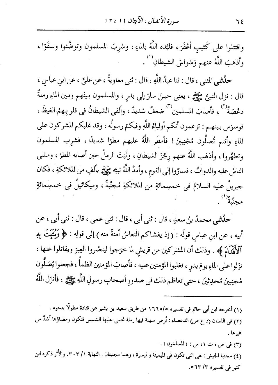 حَدَّثَنِي الْمُثَنَّى، قَالَ: ثنا عَبْدُ اللَّهِ، قَالَ: ثني مُعَاوِيَةُ، عَنْ عَلِيٍّ، عَنِ ابْنِ عَبَّاسٍ، قَالَ: " §نَزَلَ النَّبِيُّ صَلَّى اللهُ عَلَيْهِ وَسَلَّمَ يَعْنِي حِينَ سَارَ إِلَى بَدْرٍ وَالْمُسْلِمُونَ بَيْنَهُمْ وَبَيْنَ الْمَاءِ رَمْلَةٌ دِعْصَةٌ فَأَصَابَ الْمُسْلِمِينَ ضَعْفٌ شَدِيدٌ، وَأَلْقَى الشَّيْطَانُ فِي قُلُوبِهِمُ الْغَيْظَ، فَوَسْوَسَ بَيْنَهُمْ: تَزْعُمُونَ أَنَّكُمْ أَوْلِيَاءُ اللَّهِ وَفِيكُمْ رَسُولُهُ، وَقَدْ غَلَبَكُمُ الْمُشْرِكُونَ عَلَى الْمَاءِ وَأَنْتُمْ تُصَلُّونَ مُجْنِبِينَ، فَأَمْطَرَ اللَّهُ عَلَيْهِمْ مَطَرًا شَدِيدًا، فَشَرِبَ الْمُسْلِمُونَ وَتَطَهَّرُوا، وَأَذْهَبَ اللَّهُ عَنْهُمْ رِجْزَ الشَّيْطَانِ، وَثَبَّتَ الرَّمْلَ حِينَ أَصَابَهُ الْمَطَرُ، وَمَشَى النَّاسُ عَلَيْهِ وَالدَّوَابُّ فَسَارُوا إِلَى الْقَوْمِ، وَأَمَدَّ اللَّهُ نَبِيَّهُ بِأَلْفٍ مِنَ الْمَلَائِكَةِ، فَكَانَ جِبْرِيلُ عَلَيْهِ السَّلَامُ فِي خَمْسِمِائَةٍ مِنَ الْمَلَائِكَةِ مُجَنِّبَةً، وَمِيكَائِيلُ فِي خَمْسِمِائَةٍ مُجَنِّبَةً "