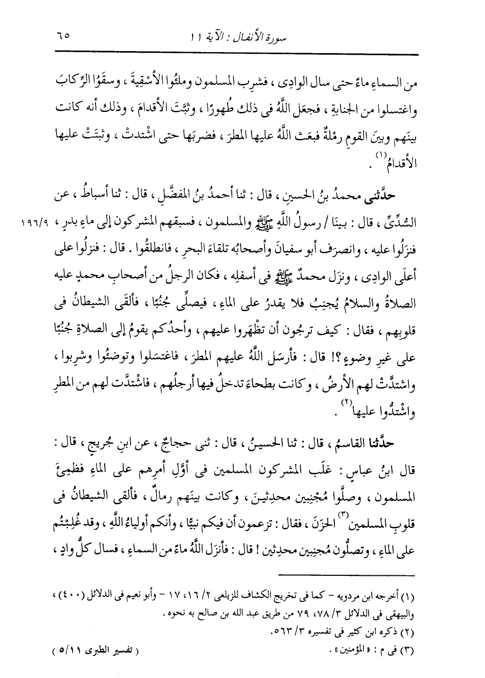 حَدَّثَنِي مُحَمَّدُ بْنُ الْحُسَيْنِ قَالَ: ثنا أَحْمَدُ بْنُ الْمُفَضَّلِ قَالَ: ثنا أَسْبَاطٌ، عَنِ السُّدِّيِّ قَالَ: " §بَيْنَا رَسُولُ اللَّهِ صَلَّى اللهُ عَلَيْهِ وَسَلَّمَ وَالْمُسْلِمُونَ، فَسَبَقَهُمُ الْمُشْرِكُونَ إِلَى مَاءِ بَدْرٍ، فَنَزَلُوا عَلَيْهِ، انْصَرَفَ أَبُو سُفْيَانَ وَأَصْحَابُهُ تِلْقَاءَ الْبَحْرِ، فَانْطَلَقُوا. قَالَ: فَنَزَلُوا عَلَى أَعْلَى الْوَادِي، وَنَزَلَ مُحَمَّدٌ صَلَّى اللهُ عَلَيْهِ وَسَلَّمَ فِي أَسْفَلِهِ. فَكَانَ الرَّجُلُ مِنْ أَصْحَابِ مُحَمَّدٍ عَلَيْهِ الصَّلَاةُ وَالسَّلَامُ يُجْنِبُ فَلَا يَقْدِرُ عَلَى الْمَاءِ، فَيُصَلِّي جُنُبًا، فَأَلْقَى الشَّيْطَانُ فِي قُلُوبِهِمْ، فَقَالَ: كَيْفَ تَرْجُونَ أَنْ تَظْهَرُوا عَلَيْهِمْ وَأَحَدُكُمْ يَقُومُ إِلَى الصَّلَاةِ جُنُبًا عَلَى غَيْرِ وُضُوءٍ؟ قَالَ: فَأَرْسَلَ اللَّهُ عَلَيْهِمُ الْمَطَرَ، فَاغْتَسَلُوا وَتَوَضَّئُوا وَشَرِبُوا، وَاشْتَدَّتْ لَهُمُ الْأَرْضُ، وَكَانَتْ بَطْحَاءَ تَدْخُلُ فِيهَا أَرْجُلُهُمْ، فَاشْتَدَّتْ لَهُمْ مِنَ الْمَطَرِ وَاشْتَدُّوا عَلَيْهَا "