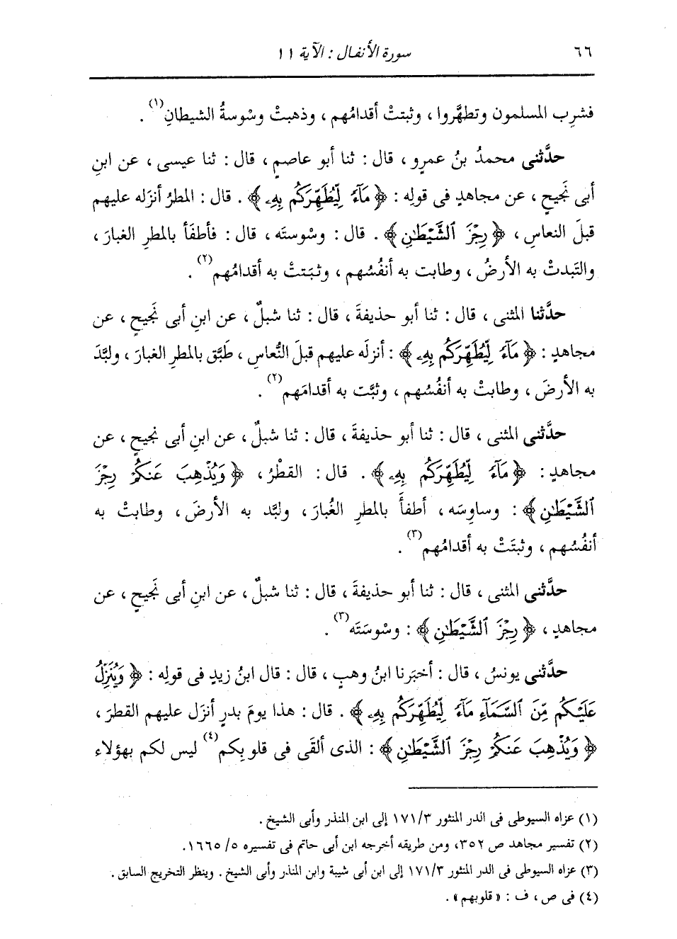 حَدَّثَنِي الْمُثَنَّى قَالَ: ثنا أَبُو حُذَيْفَةَ قَالَ: ثنا شِبْلٌ، عَنِ ابْنِ أَبِي نَجِيحٍ، عَنْ مُجَاهِدٍ: " {§مَاءً لِيُطَهِّرَكُمْ بِهِ} [الأنفال: 11] قَالَ: الْقَطْرُ {وَيُذْهِبَ عَنْكُمْ رِجْزَ الشَّيْطَانِ} [الأنفال: 11] وَسَاوِسَهُ. أَطْفَأَ بِالْمَطَرِ الْغُبَارَ، وَلَبَّدَ بِهِ الْأَرْضَ، وَطَابَتْ بِهِ أَنْفُسُهُمْ، وَثَبَتَتْ بِهِ أَقْدَامُهُمْ "