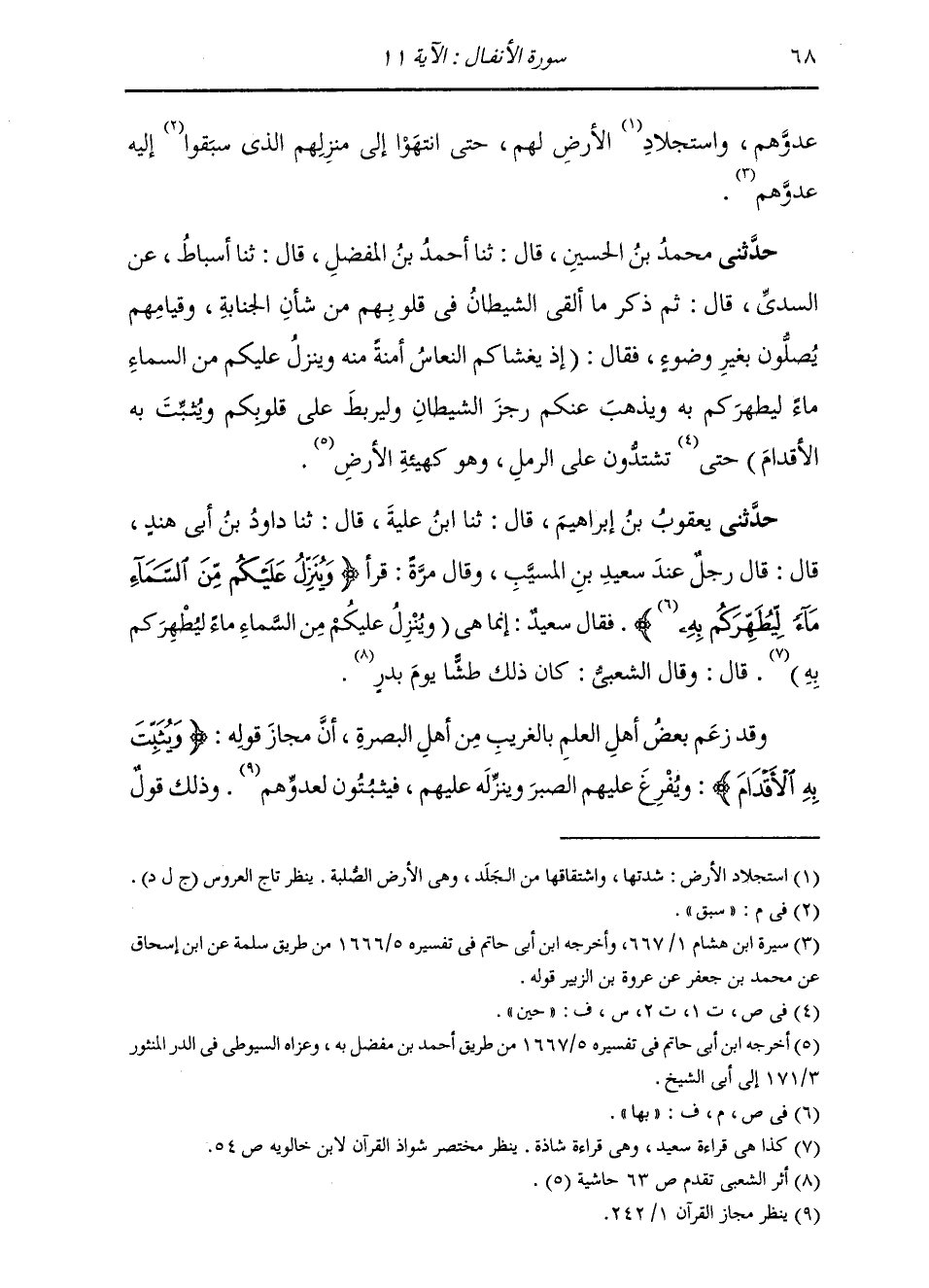 قَالَ: وَقَالَ الشَّعْبِيُّ: «§كَانَ ذَلِكَ طَشًّا يَوْمَ بَدْرٍ» وَقَدْ زَعَمَ بَعْضُ أَهْلِ الْعِلْمِ بِالْغَرِيبِ مِنْ أَهْلِ الْبَصْرَةِ، أَنَّ مَجَازَ قَوْلِهِ: {وَيُثَبِّتَ بِهِ الْأَقْدَامَ} [الأنفال: 11] وَيُفْرِغُ عَلَيْهِمُ الصَّبْرَ وَيُنَزِّلُهُ عَلَيْهِمْ، فَيَثْبُتُونَ لِعَدُوِّهِمْ. وَذَلِكَ قَوْلٌ -[69]- خِلَافٌ لِقَوْلِ جَمِيعِ أَهْلِ التَّأْوِيلِ مِنَ الصَّحَابَةِ وَالتَّابِعِينَ، وَحَسْبُ قَوْلٍ خَطَأً أَنْ يَكُونَ خِلَافًا لِقَوْلِ مَنْ ذَكَرْنَا. وَقَدْ بَيَّنَّا أَقْوَالَهُمْ فِيهِ، وَأَنَّ مَعْنَاهُ: وَيُثَبِّتَ أَقْدَامَ الْمُؤْمِنِينَ بِتَلْبِيدِ الْمَطَرِ الرَّمْلَ حَتَّى لَا تَسُوخَ فِيهِ أَقْدَامُهُمْ وَحَوَافِرُ دَوَابِّهِمْ