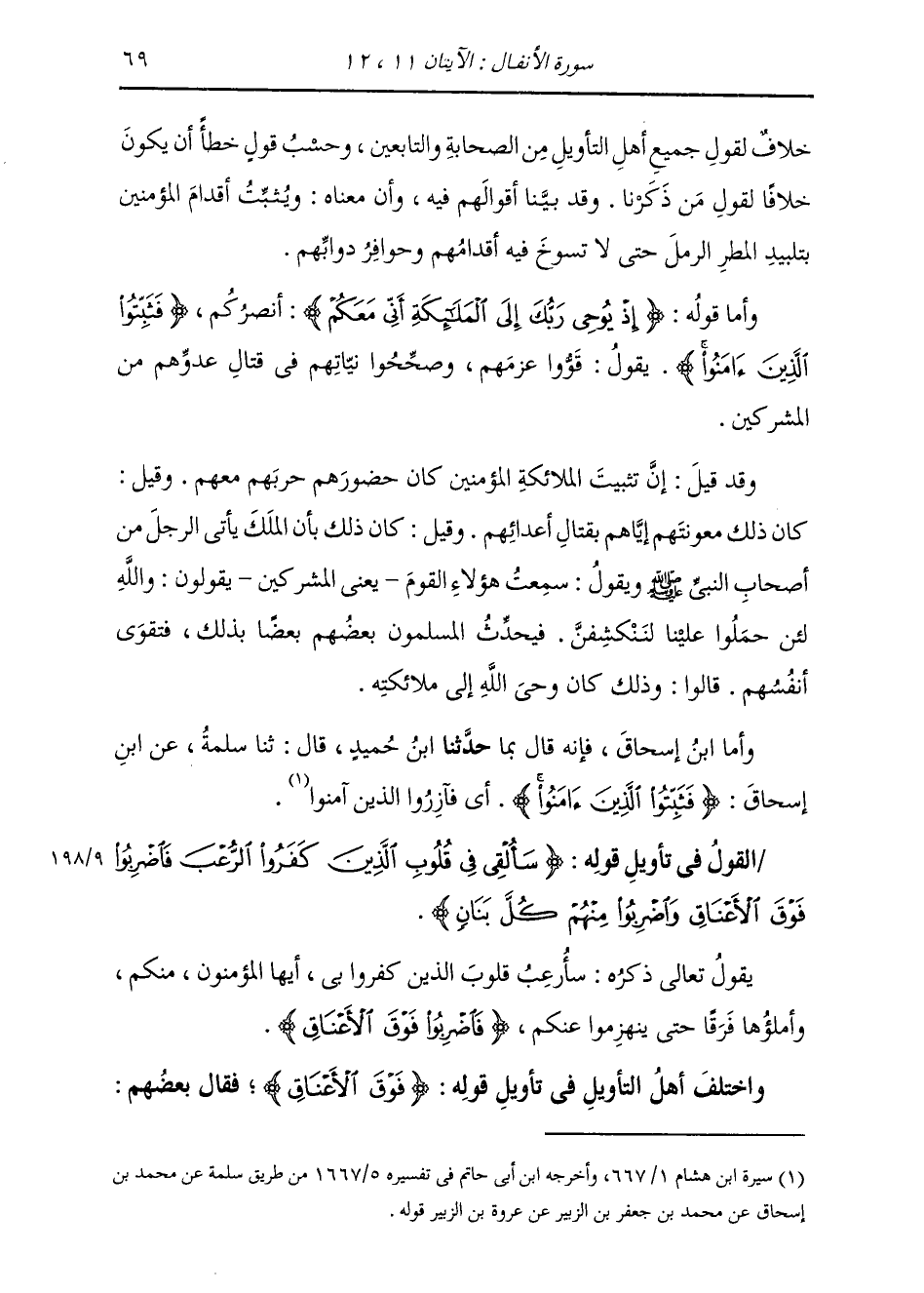 §وَأَمَّا قَوْلُهُ: {إِذْ يُوحِي رَبُّكَ إِلَى الْمَلَائِكَةِ أَنِّي مَعَكُمْ} [الأنفال: 12] أَنْصُرُكُمْ، {فَثَبِّتُوا الَّذِينَ آمَنُوا} [الأنفال: 12] يَقُولُ: قَوُّوا عَزْمَهُمْ، وَصَحِّحُوا نِيَّاتَهُمْ فِي قِتَالِ عَدُوِّهِمْ مِنَ الْمُشْرِكِينَ. وَقَدْ قِيلَ: إِنَّ تَثْبِيتَ الْمَلَائِكَةِ الْمُؤْمِنِينَ كَانَ حُضُورَهُمْ حَرْبَهُمْ مَعَهُمْ، وَقِيلَ: كَانَ ذَلِكَ مَعُونَتَهُمْ إِيَّاهُمْ بِقِتَالِ أَعْدَائِهِمْ، وَقِيلَ: كَانَ ذَلِكَ بِأَنَّ الْمَلَكَ يَأْتِي الرَّجُلَ مِنْ أَصْحَابِ النَّبِيِّ صَلَّى اللهُ عَلَيْهِ وَسَلَّمَ يَقُولُ: سَمِعْتُ هَؤُلَاءِ الْقَوْمَ يَعْنِي الْمُشْرِكِينَ يَقُولُونَ: وَاللَّهِ لَئِنْ حَمَلُوا عَلَيْنَا لَنَنْكَشِفَنَّ، فَيُحَدِّثُ الْمُسْلِمُونَ بَعْضُهُمْ بَعْضًا بِذَلِكَ، فَتَقْوَى أَنْفُسُهُمْ. قَالُوا: وَذَلِكَ كَانَ وَحْيَ اللَّهِ إِلَى مَلَائِكَتِهِ. وَأَمَّا ابْنُ إِسْحَاقَ، فَإِنَّهُ قَالَ