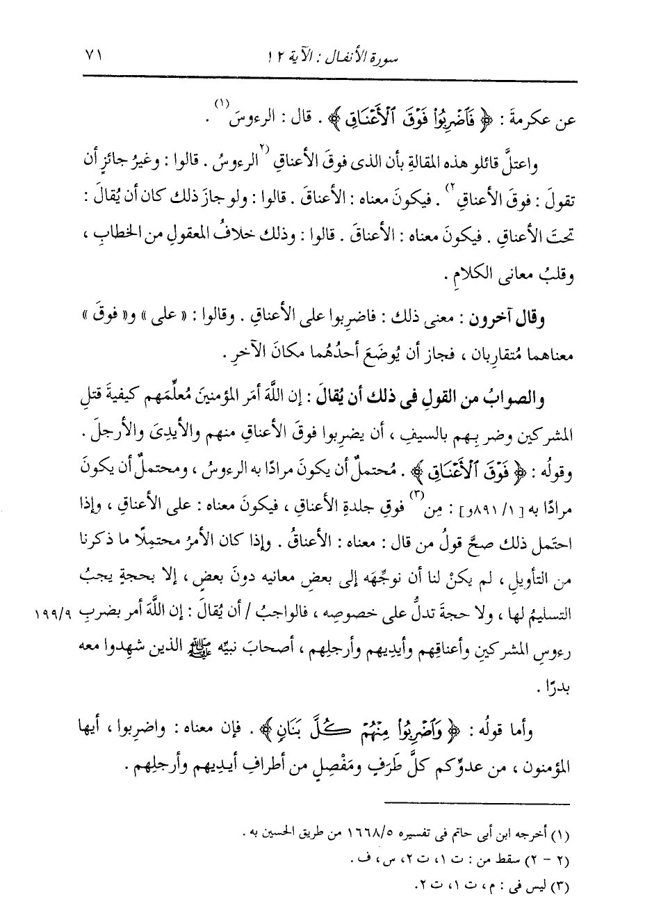 عَنْ عِكْرِمَةَ: " {§فَاضْرِبُوا فَوْقَ الْأَعناقِ} [الأنفال: 12] قَالَ: الرُّءُوسَ " وَاعْتَلَّ قَائِلُو هَذِهِ الْمَقَالَةِ بِأَنَّ الَّذِي فَوْقَ الْأَعناقِ الرُّءُوسُ، وَقَالُوا: وَغَيْرُ جَائِزٍ أَنْ تَقُولَ: فَوْقَ الْأَعناقِ، فَيَكُونَ مَعْنَاهُ الْأَعناقَ. قَالُوا: وَلَوْ جَازَ كَانَ أَنْ يُقَالَ تَحْتَ الْأَعناقِ، فَيَكُونَ مَعْنَاهُ الْأَعناقَ. قَالُوا: وَذَلِكَ خِلَافُ الْمَعْقُولِ مِنَ الْخَطَّابِ، وَقَلْبُ مَعَانِي الْكَلَامِ. وَقَالَ آخَرُونَ: مَعْنَى ذَلِكَ: فَاضْرِبُوا عَلَى الْأَعناقِ. وَقَالُوا: «عَلَى» و «فَوْقَ» مَعْنَاهُمَا مُتَقَارِبَانِ، فَجَازَ أَنْ يُوضَعَ أَحَدُهُمَا مَكَانَ الْآخَرِ. وَالصَّوَابُ مِنَ الْقَوْلِ فِي ذَلِكَ أَنْ يُقَالَ: إِنَّ اللَّهَ أَمَرَ الْمُؤْمِنِينَ مُعَلِّمَهُمْ كَيْفِيَّةَ قَتْلِ الْمُشْرِكِينَ وَضَرْبِهِمْ بِالسَّيْفِ أَنْ يَضْرِبُوا فَوْقَ الْأَعناقِ مِنْهُمْ وَالْأَيْدِيَ وَالْأَرْجُلَ، وَقَوْلُهُ: {فَوْقَ الْأَعناقِ} [الأنفال: 12] مُحْتَمَلٌ أَنْ يَكُونَ مُرَادًا بِهِ الرُّءُوسُ، وَمُحْتَمَلٌ أَنْ يَكُونَ مُرَادًا بِهِ فَوْقَ جِلْدَةِ الْأَعناقِ، فَيَكُونَ مَعْنَاهُ: عَلَى الْأَعناقِ وَإِذَا احْتَمَلَ ذَلِكَ صَحَّ قَوْلُ مَنْ قَالَ: مَعْنَاهُ الْأَعناقُ. وَإِذَا كَانَ الْأَمْرُ مُحْتَمِلًا مَا ذَكَرْنَا مِنَ التَّأْوِيلِ، لَمْ يَكُنْ لَنَا أَنْ نُوَجِّهَهُ إِلَى بَعْضِ مَعَانِيهِ دُونَ بَعْضٍ إِلَّا بِحُجَّةٍ يَجِبُ التَّسْلِيمُ لَهَا، وَلَا حُجَّةَ تَدُلُّ عَلَى خُصُوصِهِ، فَالْوَاجِبُ أَنْ يُقَالَ: إِنَّ اللَّهَ أَمَرَ بِضَرْبِ رُءُوسِ الْمُشْرِكِينَ وَأَعناقِهِمْ وَأَيْدِيِهِمْ وَأَرْجُلِهِمْ أَصْحَابَ نَبِيِّهِ صَلَّى اللهُ عَلَيْهِ وَسَلَّمَ الَّذِينَ شَهِدُوا مَعَهُ بَدْرًا