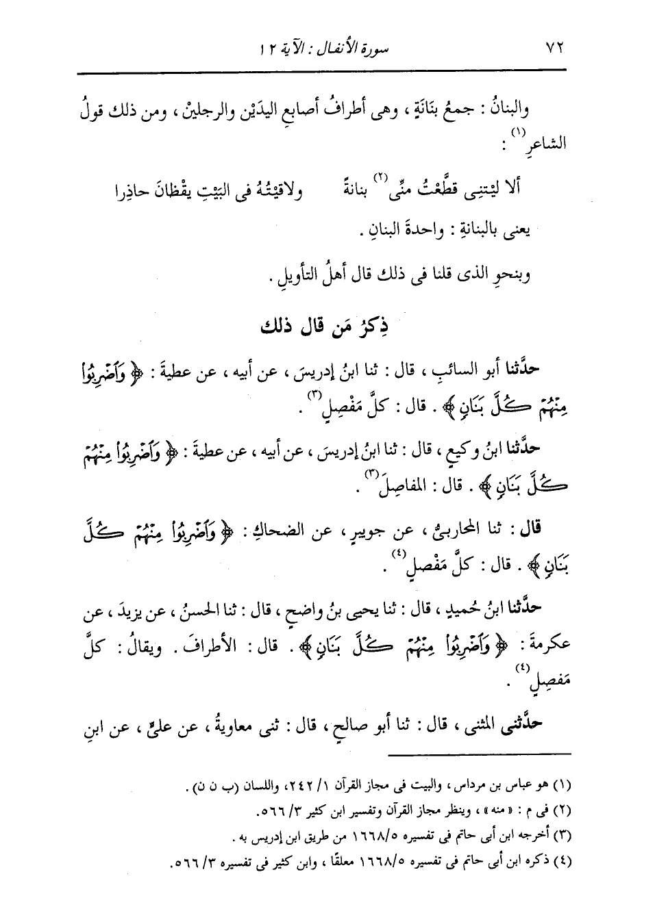 حَدَّثَنِي الْمُثَنَّى، قَالَ: ثنا أَبُو صَالِحٍ، قَالَ: ثني مُعَاوِيَةُ، عَنْ عَلِيٍّ، عَنِ ابْنِ -[73]- عَبَّاسٍ: " {§وَاضْرِبُوا مِنْهُمْ كُلَّ بَنَانٍ} [الأنفال: 12] يَعْنِي بِالْبَنَانِ الْأَطْرَافَ "