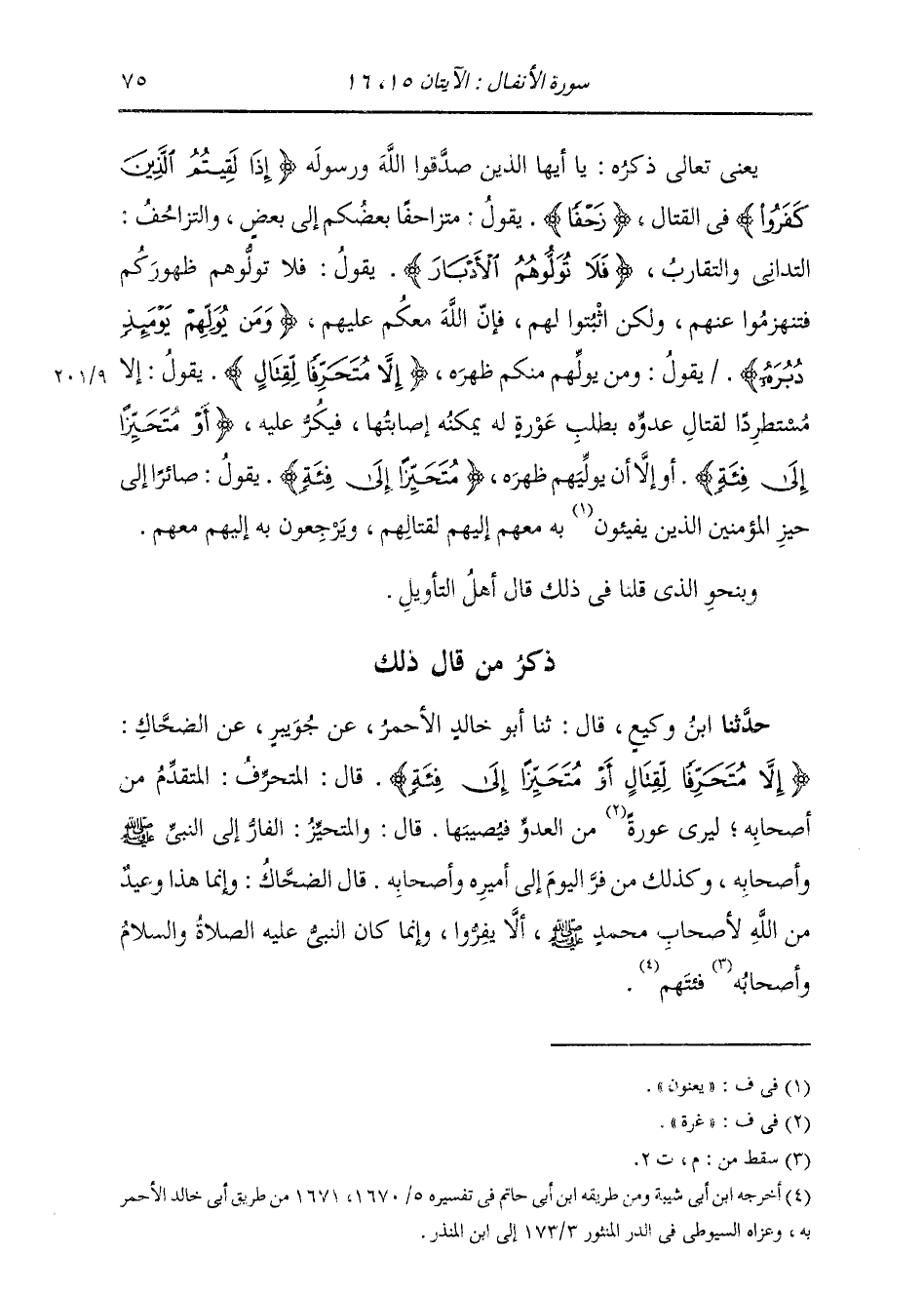 ذِكْرُ مَنْ قَالَ ذَلِكَ: حَدَّثَنَا ابْنُ وَكِيعٍ، قَالَ: ثنا أَبُو خَالِدٍ الْأَحْمَرُ، عَنْ جُوَيْبِرٍ، عَنِ الضَّحَّاكِ: " {§إِلَّا مُتَحَرِّفًا لِقِتَالٍ أَوْ مُتَحَيِّزًا إِلَى فِئَةٍ} [الأنفال: 16] قَالَ: الْمُتَحَرِّفُ: الْمُتَقَدِّمُ مِنْ أَصْحَابِهِ لِيَرَى غُرَّةً مِنَ الْعَدُوِّ فَيُصِيبَهَا. قَالَ: وَالْمُتَحَيِّزُ: الْفَارُّ إِلَى النَّبِيِّ صَلَّى اللهُ عَلَيْهِ وَسَلَّمَ وَأَصْحَابِهِ، وَكَذَلِكَ مَنْ فَرَّ الْيَوْمَ إِلَى أَمِيرِهِ أَوْ أَصْحَابِهِ. قَالَ الضَّحَّاكُ: وَإِنَّمَا هَذَا وَعِيدٌ مِنَ اللَّهِ لِأَصْحَابِ مُحَمَّدٍ صَلَّى اللهُ عَلَيْهِ وَسَلَّمَ أَنْ لَا يَفِرُّوا، وَإِنَّمَا كَانَ النَّبِيُّ عَلَيْهِ الصَّلَاةُ وَالسَّلَامُ فِئَتَهُمْ "