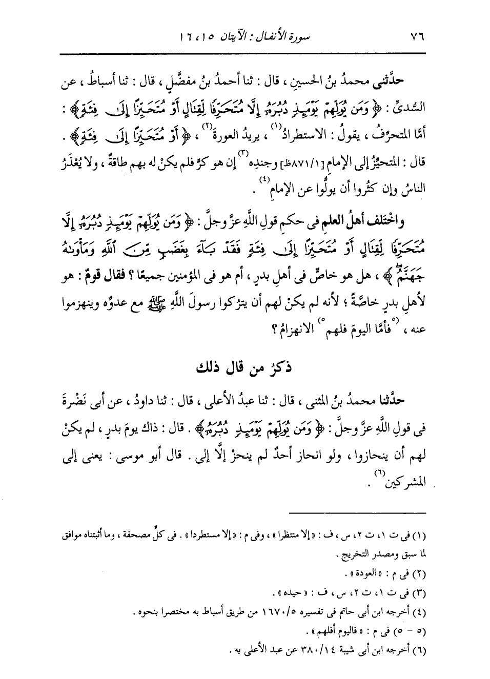 حَدَّثَنِي مُحَمَّدُ بْنُ الْحُسَيْنِ، قَالَ: ثنا أَحْمَدُ بْنُ الْمُفَضَّلِ، قَالَ: ثنا أَسْبَاطٌ، عَنِ السُّدِّيِّ: " {§وَمَنْ يُوَلِّهِمْ يَوْمَئِذٍ دُبُرَهُ إِلَّا مُتَحَرِّفًا لِقِتَالٍ أَوْ مُتَحَيِّزًا إِلَى فِئَةٍ} [الأنفال: 16] أَمَّا الْمُتَحَرِّفُ يَقُولُ: إِلَّا مُسْتَطْرِدًا، يُرِيدُ الْعَوْدَةَ. {أَوْ مُتَحَيِّزًا إِلَى فِئَةٍ} [الأنفال: 16] قَالَ: الْمُتَحَيِّزُ إِلَى الْإِمَامِ وَجُنْدِهِ إِنْ هُوَ كَرَّ فَلَمْ يَكُنْ لَهُ بِهِمْ طَاقَةٌ، وَلَا يُعْذَرُ النَّاسُ وَإِنْ كَثُرُوا أَنْ يُوَلُّوا عَنِ الْإِمَامِ " وَاخْتَلَفَ أَهْلُ الْعِلْمِ فِي حُكْمِ قَوْلِ اللَّهِ عَزَّ وَجَلَّ: {وَمَنْ يُوَلِّهِمْ يَوْمَئِذٍ دُبُرَهُ إِلَّا مُتَحَرِّفًا لِقِتَالٍ أَوْ مُتَحَيِّزًا إِلَى فِئَةٍ فَقَدْ بَاءَ بِغَضَبٍ مِنَ اللَّهِ وَمَأْوَاهُ جَهَنَّمُ} [الأنفال: 16] هَلْ هُوَ خَاصٌّ فِي أَهْلِ بَدْرٍ، أَمْ هُوَ فِي الْمُؤْمِنِينَ جَمِيعًا؟ فَقَالَ قَوْمٌ: هُوَ لِأَهْلِ بَدْرٍ خَاصَّةً؛ لِأَنَّهُ لَمْ يَكُنْ لَهُمْ أَنْ يَتْرُكُوا رَسُولَ اللَّهِ صَلَّى اللهُ عَلَيْهِ وَسَلَّمَ مَعَ عَدُوِّهِ وَيَنْهَزِمُوا عَنْهُ فَأَمَّا الْيَوْمَ فَلَهُمُ الِانْهِزَامُ
