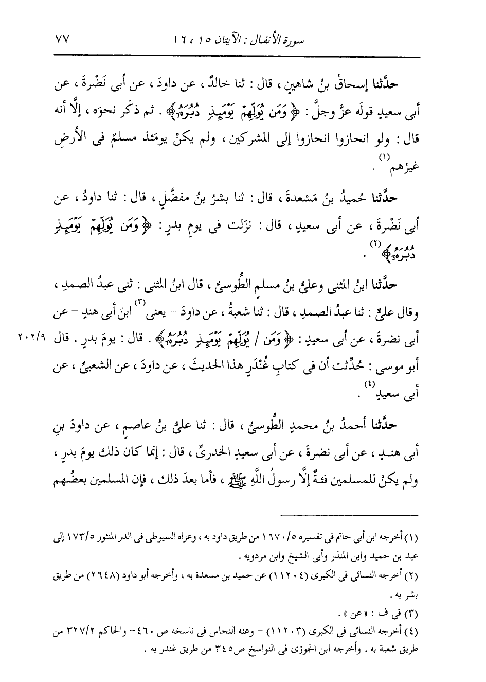 حَدَّثَنَا حُمَيْدُ بْنُ مَسْعَدَةَ، قَالَ: ثنا بِشْرُ بْنُ مُفَضَّلٍ، قَالَ: ثنا دَاوُدُ، عَنْ أَبِي نَضْرَةَ، عَنْ أَبِي سَعِيدٍ، قَالَ: " §نَزَلَتْ فِي يَوْمِ بَدْرٍ: {وَمَنْ يُوَلِّهِمْ يَوْمَئِذٍ دُبُرَهُ} [الأنفال: 16] "