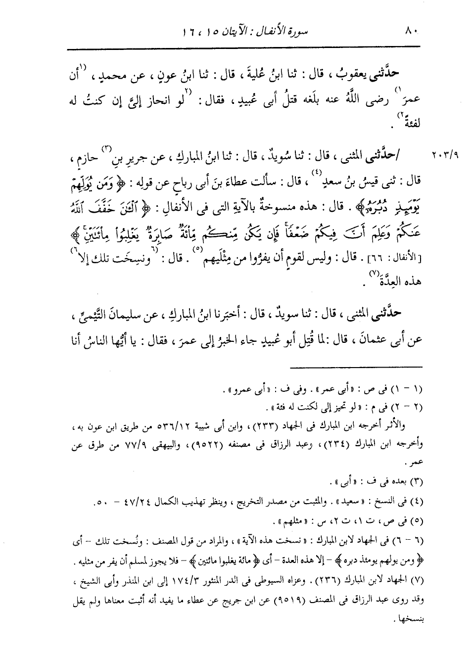 حَدَّثَنِي الْمُثَنَّى، قَالَ: ثنا سُوَيْدٌ، قَالَ: ثنا ابْنُ الْمُبَارَكِ، عَنْ جَرِيرِ بْنِ حَازِمٍ، قَالَ: ثني قَيْسُ بْنُ سَعِيدٍ قَالَ: سَأَلْتُ عَطَاءَ بْنَ أَبِي رَبَاحٍ، عَنْ قَوْلِهِ: " {§وَمَنْ يُوَلِّهِمْ يَوْمَئِذٍ دُبُرَهُ} [الأنفال: 16] قَالَ: هَذِهِ مَنْسُوخَةٌ بِالْآيَةِ الَّتِي فِي الْأَنْفَالِ: {الْآنَ خَفَّفَ اللَّهُ عَنْكُمْ وَعَلِمَ أَنَّ فِيكُمْ ضَعْفًا فَإِنْ يَكُنْ مِنْكُمْ مِائَةٌ صَابِرَةٌ يَغْلِبُوا مِائَتَيْنِ} قَالَ: وَلَيْسَ لِقَوْمٍ أَنْ يَفِرُّوا مِنْ مِثْلَيْهِمْ. قَالَ: وَنُسِخَتْ تِلْكَ إِلَّا هَذِهِ الْعِدَّةَ "