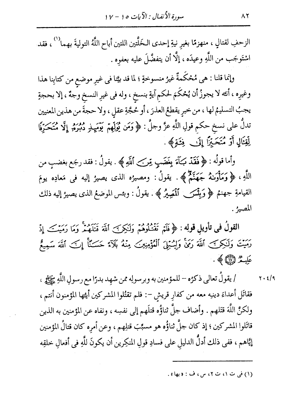 §الْقَوْلُ فِي تَأْوِيلِ قَوْلِهِ تَعَالَى: {فَلَمْ تَقْتُلُوهُمْ وَلَكِنَّ اللَّهَ قَتَلَهُمْ وَمَا رَمَيْتَ إِذْ رَمَيْتَ وَلَكِنَّ اللَّهَ رَمَى وَلْيُبْلِيَ الْمُؤْمِنِينَ مِنْهُ بَلًاءً حَسَنًا إِنَّ اللَّهَ سَمِيعٌ عَلِيمٌ} [الأنفال: 17] يَقُولُ تَعَالَى ذِكْرُهُ لِلْمُؤْمِنِينَ بِهِ وَبِرَسُولِهِ مِمَّنْ شَهِدَ بَدْرًا مَعَ رَسُولِ اللَّهِ صَلَّى اللهُ عَلَيْهِ وَسَلَّمَ فَقَاتَلَ أَعْدَاءَ دِينِهِ مَعَهُ مِنْ كُفَّارِ قُرَيْشٍ: فَلَمْ تَقْتُلُوا الْمُشْرِكِينَ أَيُّهَا الْمُؤْمِنُونَ أَنْتُمْ، وَلَكِنَّ اللَّهَ قَتَلَهُمْ. وَأَضَافَ جَلَّ ثَنَاؤُهُ قَتْلَهُمْ إِلَى نَفْسِهِ، وَنَفَاهُ عَنِ الْمُؤْمِنِينَ بِهِ الَّذِينَ قَاتِلُوا الْمُشْرِكِينَ؛ إِذْ كَانَ جَلَّ ثَنَاؤُهُ هُوَ مُسَبِّبٌ قَتَلَهُمْ، وَعَنْ أَمْرِهِ كَانَ قِتَالُ الْمُؤْمِنِينَ إِيَّاهُمْ، فَفِي ذَلِكَ أَدَلُّ الدَّلِيلِ عَلَى فَسَادِ قَوْلِ الْمُنْكِرِينَ أَنْ يَكُونَ لِلَّهِ فِي أَفْعَالِ خَلْقِهِ