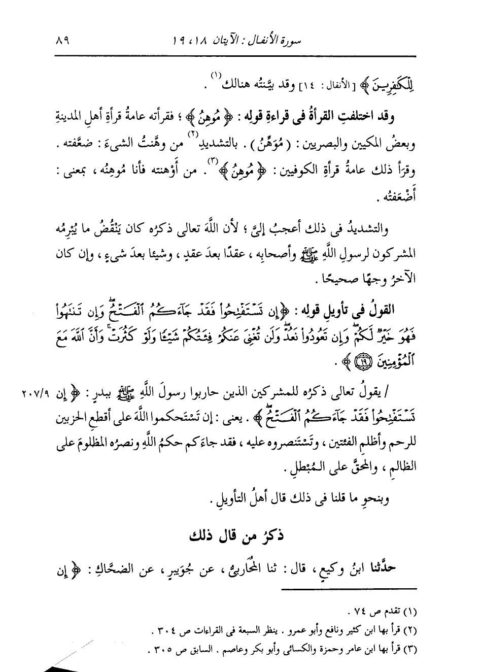 لِلْكَافِرِينَ} [الأنفال: 14] وَقَدْ بَيَّنْتُهُ هُنَالِكَ. وَقَدِ اخْتَلَفَتِ الْقُرَّاءُ فِي قِرَاءَةِ قَوْلِهِ: {مُوهِنُ} [الأنفال: 18] فَقَرَأَتْهُ عَامَّةُ قُرَّاءِ أَهْلِ الْمَدِينَةِ وَبَعْضُ الْمَكِّيِّينَ وَالْبَصْرِيِّينَ: (مُوَهِّنُ) بِالتَّشْدِيدِ، مِنْ وَهَّنْتُ الشَّيْءَ: ضَعَّفْتُهُ. وَقَرَأَ ذَلِكَ عَامَّةُ قُرَّاءِ الْكُوفِيِّينَ: {مُوهِنُ} [الأنفال: 18] مِنْ أَوْهَنْتُهُ فَأَنَا مُوهِنُهُ، بِمَعْنَى أَضْعَفْتُهُ. وَالتَّشْدِيدُ فِي ذَلِكَ أَعْجَبُ إِلَيَّ؛ لِأَنَّ اللَّهَ تَعَالَى كَانَ يَنْقُضُ مَا يُبْرِمُهُ الْمُشْرِكُونَ لِرَسُولِ اللَّهِ صَلَّى اللهُ عَلَيْهِ وَسَلَّمَ وَأَصْحَابِهِ، عَقْدًا بَعْدَ عَقْدٍ، وَشَيْئًا بَعْدَ شَيْءٍ، وَإِنْ كَانَ الْآخَرُ وَجْهًا صَحِيحًا