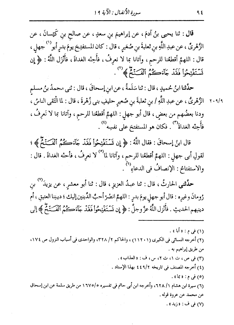 حَدَّثَنَا ابْنُ حُمَيْدٍ قَالَ: ثنا سَلَمَةُ، عَنِ ابْنِ إِسْحَاقَ قَالَ: ثني مُحَمَّدُ بْنُ مُسْلِمٍ الزُّهْرِيُّ، عَنْ عَبْدِ اللَّهِ بْنِ ثَعْلَبَةَ بْنِ صُعَيْرٍ، حَلِيفِ بَنِي زُهْرَةَ قَالَ: " §لَمَّا الْتَقَى النَّاسُ، وَدَنَا بَعْضُهُمْ مِنْ بَعْضٍ قَالَ أَبُو جَهْلٍ: اللَّهُمَّ أَقْطَعنا لِلرَّحِمِ، وَآتَانَا بِمَا لَا نَعْرِفُ، فَأَحِنْهُ الْغَدَاةَ، فَكَانَ هُوَ الْمُسْتَفْتِحَ عَلَى نَفْسِهِ " قَالَ ابْنُ إِسْحَاقَ: فَقَالَ اللَّهُ: {إِنْ تَسْتَفْتِحُوا فَقَدْ جَاءَكُمُ الْفَتْحُ} [الأنفال: 19] لِقَوْلِ أَبِي جَهْلٍ: اللَّهُمَّ أَقْطَعنا لِلرَّحِمِ، وَآتَانَا بِمَا لَا نَعْرِفُ، فَأَحِنْهُ لِلْغَدَاةِ قَالَ: الِاسْتِفْتَاحُ: الْإِنْصَافُ فِي الدُّعَاءِ