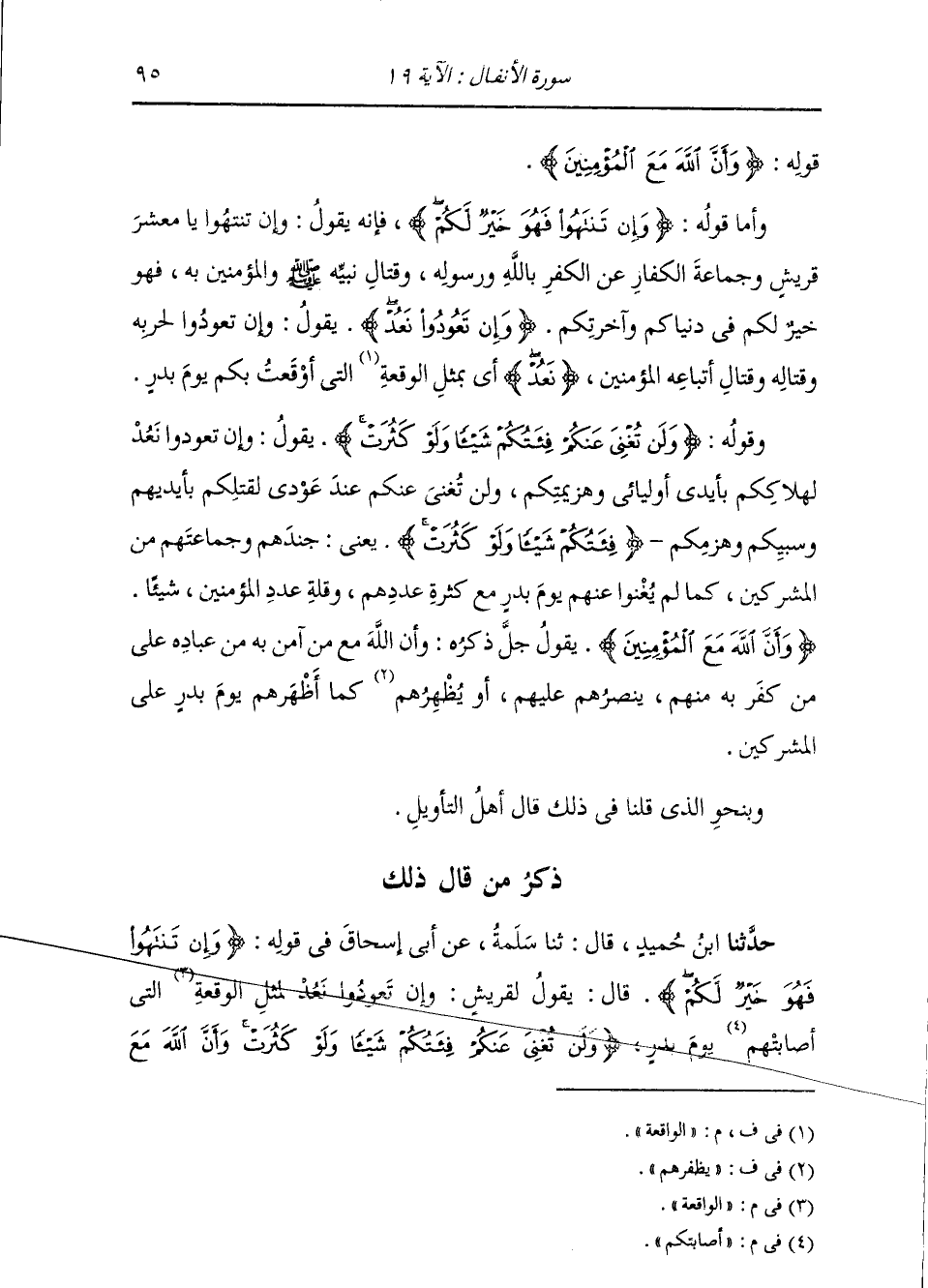 ذِكْرُ مَنْ قَالَ ذَلِكَ: حَدَّثَنَا ابْنُ حُمَيْدٍ، قَالَ: ثنا سَلَمَةُ، عَنِ ابْنِ إِسْحَاقَ، فِي قَوْلِهِ: " {§وَإِنْ تَنْتَهُوا فَهُوَ خَيْرٌ لَكُمْ} [الأنفال: 19] قَالَ: يَقُولُ لِقُرَيْشٍ: وَإِنْ تَعُودُوا نَعُدْ لِمِثْلِ الْوَاقِعَةِ الَّتِي أَصَابَتْكُمْ يَوْمَ بَدْرٍ. {وَلَنْ تُغْنِيَ عَنْكُمْ فِئَتُكُمْ شَيْئًا وَلَوْ كَثُرَتْ وَأَنَّ اللَّهَ مَعَ