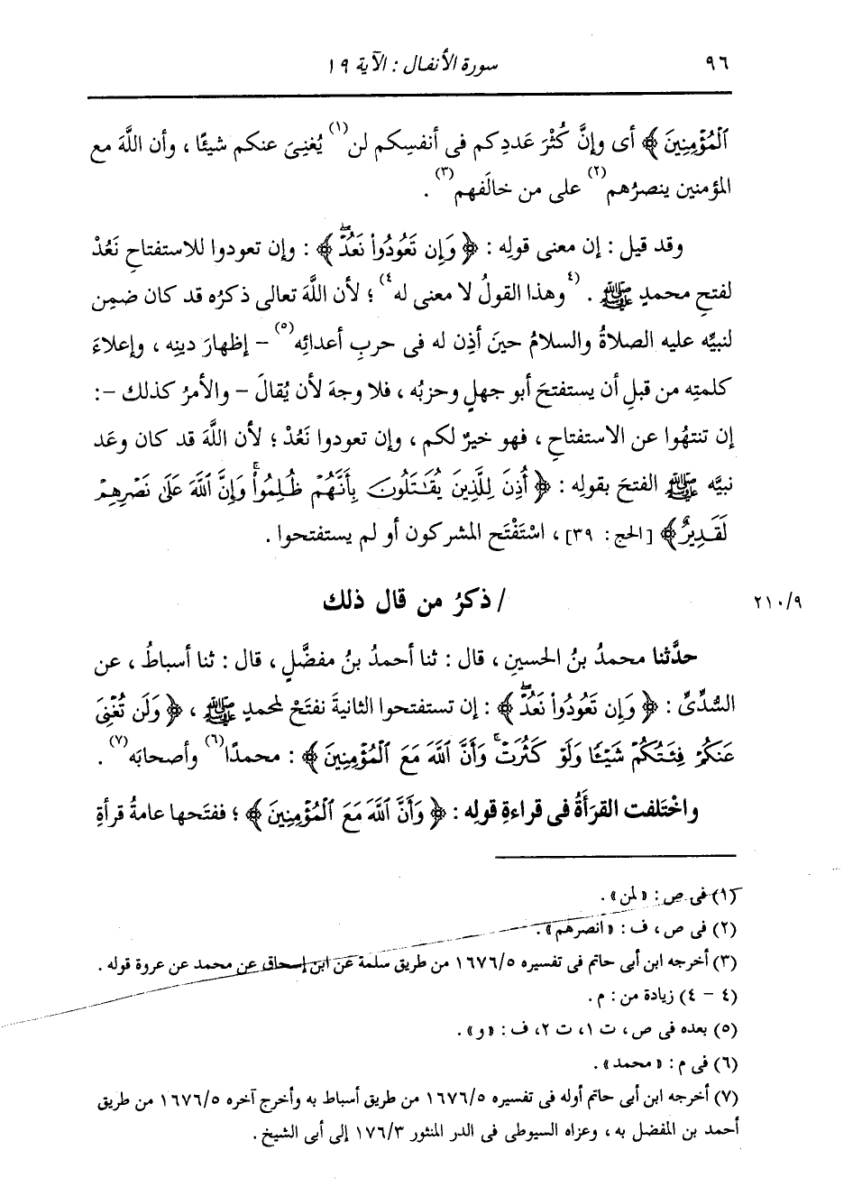ذِكْرُ مَنْ قَالَ ذَلِكَ: حَدَّثَنَا مُحَمَّدُ بْنُ الْحُسَيْنِ، قَالَ: ثنا أَحْمَدُ بْنُ الْمُفَضَّلِ، قَالَ: ثنا أَسْبَاطٌ، عَنِ السُّدِّيِّ: " {§وَإِنْ تَعُودُوا نَعُدْ} [الأنفال: 19] إِنْ تَسْتَفْتِحُوا الثَّانِيَةَ نَفْتَحْ لِمُحَمَّدٍ صَلَّى اللهُ عَلَيْهِ وَسَلَّمَ. {وَلَنْ تُغْنِيَ عَنْكُمْ فِئَتُكُمْ شَيْئًا وَلَوْ كَثُرَتْ وَأَنَّ اللَّهَ مَعَ الْمُؤْمِنِينَ} [الأنفال: 19] مُحَمَّدٍ وَأَصْحَابِهِ ". وَاخْتَلَفَتِ الْقُرَّاءُ فِي قِرَاءَةِ قَوْلِهِ: {وَأَنَّ اللَّهَ مَعَ الْمُؤْمِنِينَ} [الأنفال: 19] فَفَتَحَهَا عَامَّةُ قُرَّاءِ -[97]- أَهْلِ الْمَدِينَةِ، بِمَعْنَى: وَلَنْ تُغْنِيَ عَنْكُمْ فِئَتُكُمْ شَيْئًا وَلَوْ كَثُرَتْ، وَأَنَّ اللَّهَ مَعَ الْمُؤْمِنِينَ. فَعَطَفَ بِـ «أَنَّ» . عَلَى مَوْضِعِ «وَلَوْ كَثُرَتْ» كَأَنَّهُ قَالَ: لِكَثْرَتِهَا، وَلِأَنَّ اللَّهَ مَعَ الْمُؤْمِنِينَ، وَيَكُونُ مَوْضِعُ «أَنَّ» حِينَئِذٍ نَصْبًا عَلَى هَذَا الْقَوْلِ. وَكَانَ بَعْضُ أَهْلِ الْعَرَبِيَّةِ يَزْعُمُ أَنَّ فَتَحَهَا إِذَا فُتِحَتْ عَلَى: {وَأَنَّ اللَّهَ مُوهِنُ كَيَدِ الْكَافِرِينَ} [الأنفال: 18] ، {وَأَنَّ اللَّهَ مَعَ الْمُؤْمِنِينَ} [الأنفال: 19] عَطْفًا بِالْأُخْرَى عَلَى الْأُولَى. وَقَرَأَ ذَلِكَ عَامَّةُ قُرَّاءِ الْكُوفِيِّينَ وَالْبَصْرِيِّينَ: (وَإِنَّ اللَّهَ) بِكَسْرِ الْأَلْفِ عَلَى الِابْتِدَاءِ، وَاعْتَلُّوا بِأَنَّهَا فِي قِرَاءَةِ عَبْدِ اللَّهِ: «وَإِنَّ اللَّهَ لَمَعَ الْمُؤْمِنِينَ» . وَأَوْلَى الْقِرَاءَتَيْنِ بِالصَّوَابِ، قِرَاءَةُ مَنْ كَسِرَ إِنَّ لِلِابْتِدَاءِ، لِتَقَضِّيَ الْخَبَرُ قَبْلَ ذَلِكَ عَمَّا يَقْتَضِي قَوْلَهُ: {وَإِنَّ اللَّهَ مَعَ الْمُؤْمِنِينَ}