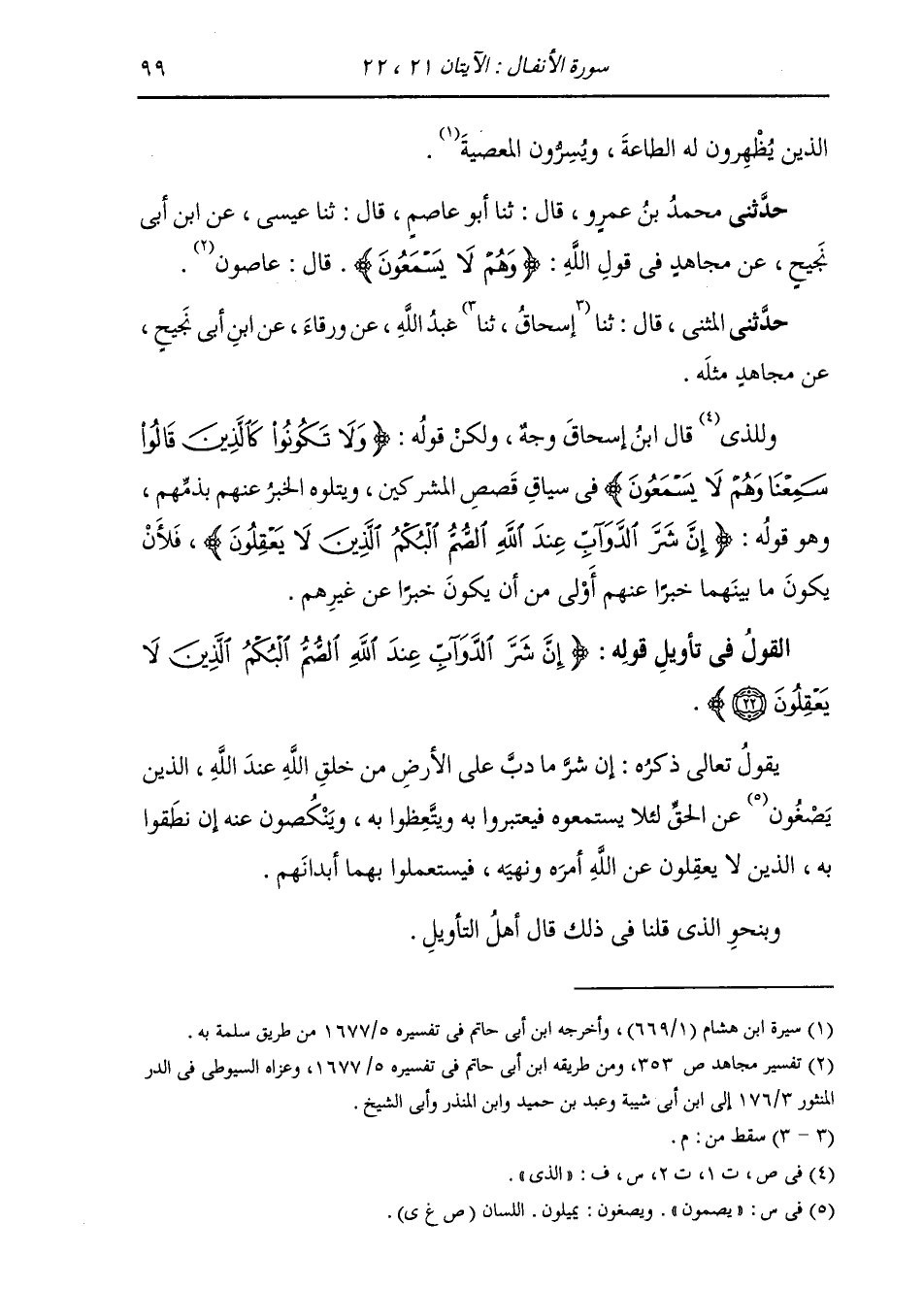 حَدَّثَنِي مُحَمَّدُ بْنُ عَمْرٍو، قَالَ: ثنا أَبُو عَاصِمٍ، قَالَ: ثنا عِيسَى، عَنِ ابْنِ أَبِي نَجِيحٍ، عَنْ مُجَاهِدٍ، فِي قَوْلِ اللَّهِ: " {§وَهُمْ لَا يَسْمَعُونَ} [الأنفال: 21] قَالَ: عَاصُونَ " حَدَّثَنِي الْمُثَنَّى، قَالَ: ثنا عَبْدُ اللَّهِ، عَنْ وَرْقَاءَ، عَنِ ابْنِ أَبِي نَجِيحٍ، عَنْ مُجَاهِدٍ، مِثْلَهُ. وَلِلَّذِي قَالَ ابْنُ إِسْحَاقَ وَجْهٌ، وَلَكِنَّ قَوْلَهُ: {وَلَا تَكُونُوا كَالَّذِينَ قَالُوا سَمِعْنَا وَهُمْ لَا يَسْمَعُونَ} [الأنفال: 21] فِي سِيَاقِ قَصَصِ الْمُشْرِكِينَ، وَيَتْلُوهُ الْخَبَرُ عَنْهُمْ بِذَمِّهِمْ، وَهُوَ قَوْلُهُ: {إِنَّ شَرَّ الدَّوَابِّ عِنْدَ اللَّهِ الصُّمُّ الْبُكْمُ الَّذِينَ لَا يَعْقِلُونَ} [الأنفال: 22] فَلَأَنْ يَكُونَ مَا بَيْنَهُمَا خَبَرًا عَنْهُمْ أَوْلَى مِنْ أَنْ يَكُونَ خَبَرًا عَنْ غَيْرِهِمْ