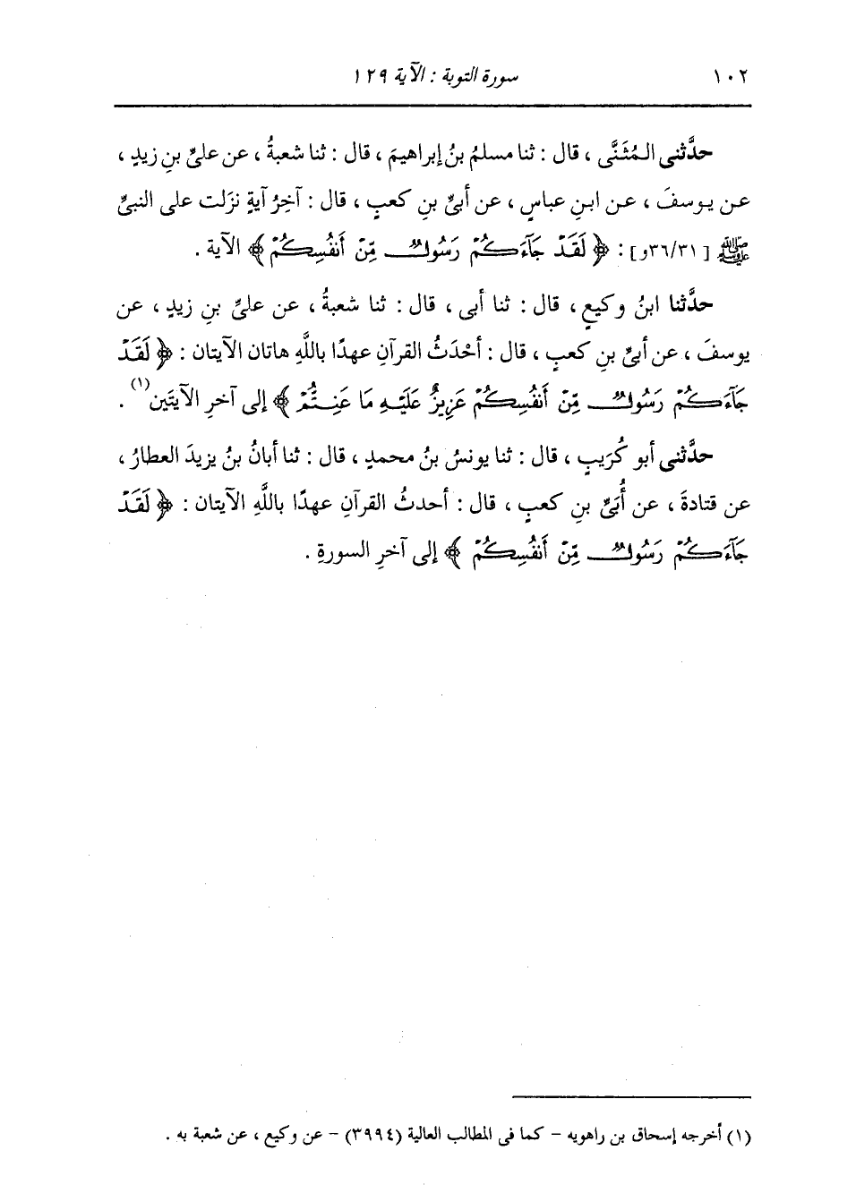 حَدَّثَنِي أَبُو كُرَيْبٍ، قَالَ: ثَنَا يُونُسُ بْنُ مُحَمَّدٍ، قَالَ: ثَنَا أَبَانُ بْنُ يَزِيدَ الْعَطَّارُ، عَنْ قَتَادَةَ، عَنْ أُبَيِّ بْنِ كَعْبٍ، قَالَ: " §أَحْدَثُ الْقُرْآنِ عَهْدًا بِاللَّهِ الْآيَتَانِ: {لَقَدْ جَاءَكُمْ رَسُولٌ مِنْ أَنْفُسِكُمْ} [التوبة: 128] . . إِلَى آخِرِ السُّورَةِ "