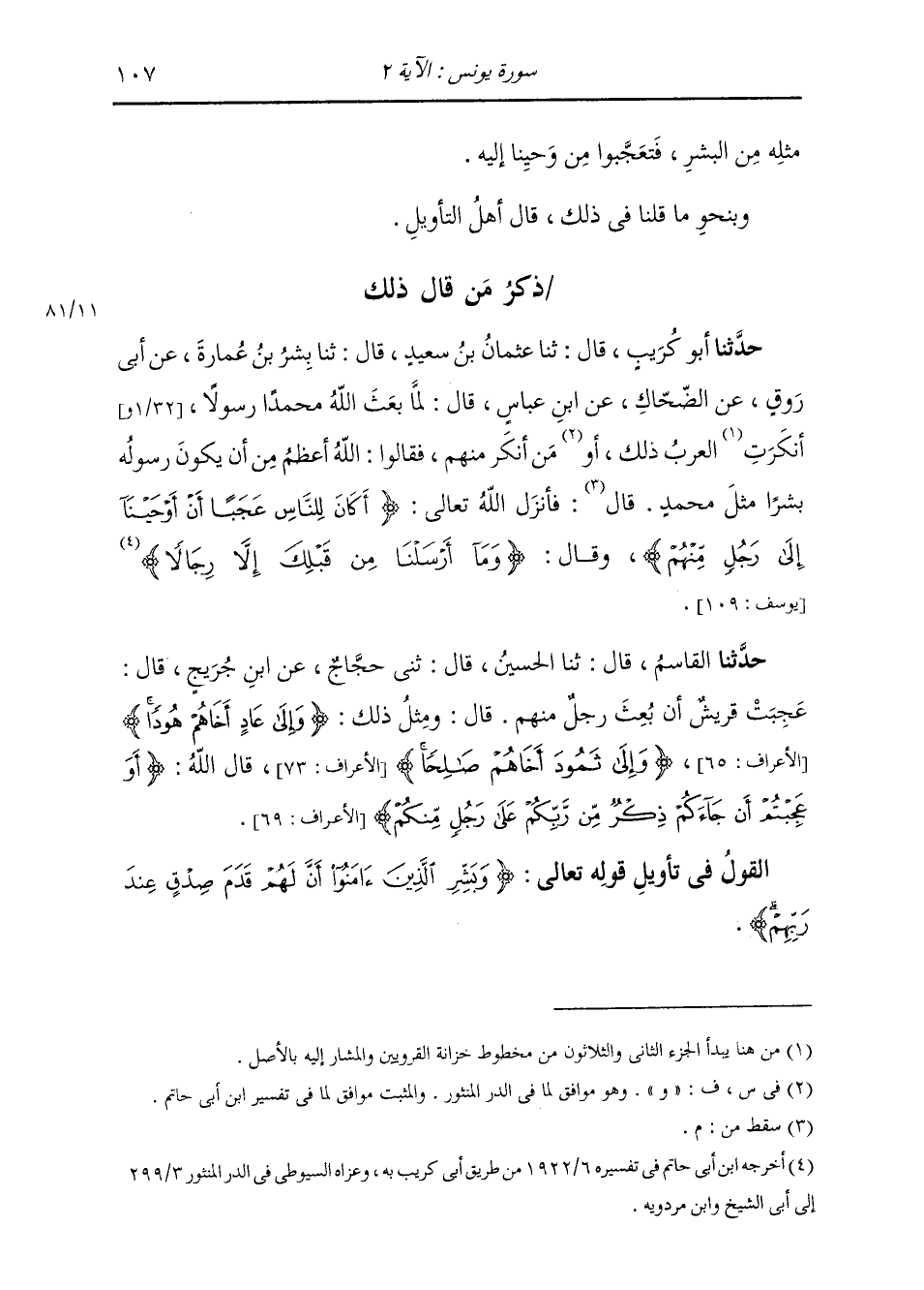 حَدَّثَنَا الْقَاسِمُ، قَالَ: ثَنَا الْحُسَيْنُ، قَالَ: ثَنِي حَجَّاجٌ، عَنِ ابْنِ جُرَيْجٍ، قَالَ: «§عَجِبَتْ قُرَيْشٌ أَنْ بُعِثَ، رَجُلٌ مِنْهُمْ» قَالَ: وَمَثَلُ ذَلِكَ: {وَإِلَى عَادٍ أَخَاهُمْ هُودًا} [الأعراف: 65] ، {وَإِلَى ثَمُودَ أَخَاهُمْ صَالِحًا} [الأعراف: 73] قَالَ اللَّهُ: {أَوَعَجِبْتُمْ أَنْ جَاءَكُمْ ذِكْرٌ مِنْ رَبِّكُمْ عَلَى رَجُلٍ مِنْكُمْ} [الأعراف: 63]