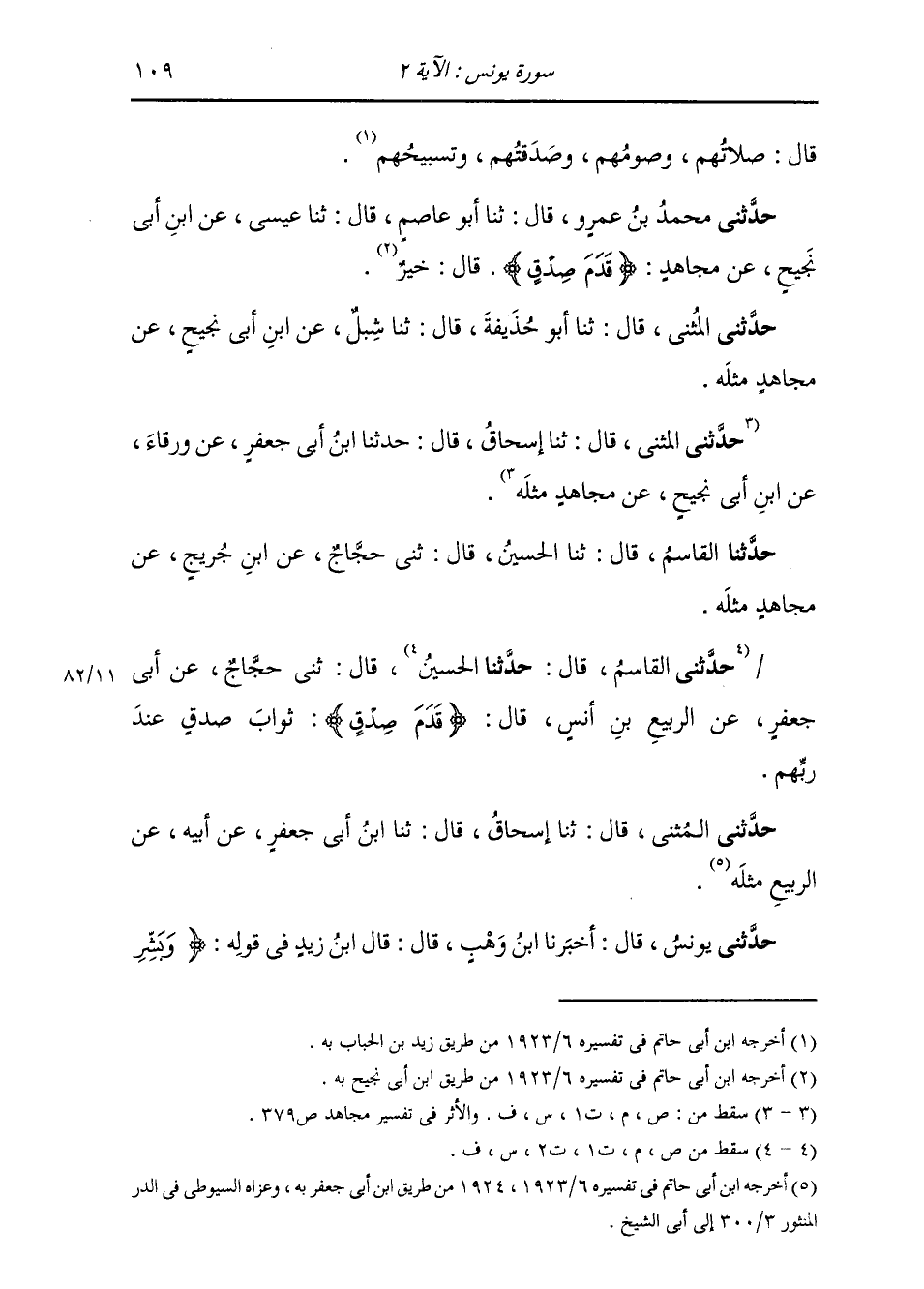 حَدَّثَنِي مُحَمَّدُ بْنُ عَمْرٍو، قَالَ: ثَنَا أَبُو عَاصِمٍ، قَالَ: ثَنَا عِيسَى، عَنِ ابْنِ أَبِي نَجِيحٍ، عَنْ مُجَاهِدٍ: " {§قَدَمَ صِدْقٍ} [يونس: 2] قَالَ: خَيْرٍ " حَدَّثَنِي الْمُثَنَّى، قَالَ: ثَنَا أَبُو حُذَيْفَةَ، قَالَ: ثَنَا شِبْلٌ، عَنِ ابْنِ أَبِي نَجِيحٍ، عَنْ مُجَاهِدٍ: {قَدَمَ صِدْقٍ} [يونس: 2] مِثْلَهُ. حَدَّثَنَا الْقَاسِمُ، قَالَ: ثَنَا الْحُسَيْنُ، قَالَ: ثَنِي حَجَّاجٌ، عَنِ ابْنِ جُرَيْجٍ، عَنْ مُجَاهِدٍ، مِثْلَهُ
