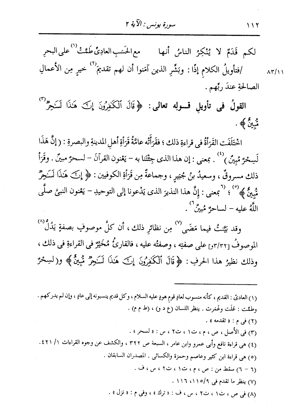 §الْقَوْلُ فِي تَأْوِيلِ قَوْلِهِ تَعَالَى: {قَالَ الْكَافِرُونَ إِنَّ هَذَا لَسَاحِرٌ مُبِينٌ} [يونس: 2] اخْتَلَفَتِ الْقُرَّاءُ فِي قِرَاءَةِ ذَلِكَ، فَقَرَأَتْهُ عَامَّةُ قُرَّاءِ أَهْلِ الْمَدِينَةِ وَالْبَصْرَةِ: {إِنَّ هَذَا لَسِحْرٌ مُبِينٌ} [يونس: 76] بِمَعْنَى: إِنَّ هَذَا الَّذِي جِئْتَنَا بِهِ، يَعْنُونَ الْقُرْآنَ «لَسِحْرٌ مُبِينٌ» وَقَرَأَ ذَلِكَ مَسْرُوقٌ وَسَعِيدُ بْنُ جُبَيْرٍ وَجَمَاعَةٌ مِنْ قُرَّاءِ الْكُوفِيِّينَ: «إِنَّ هَذَا لَسِحْرٌ مُبِينٌ» وَقَدْ بَيَّنْتُ فِيمَا مَضَى مِنْ نَظَائِرِ ذَلِكَ أَنَّ كُلَّ مَوْصُوفٍ بِصِفَةٍ نَزَلَ الْمَوْصُوفُ عَلَى صِفَتِهِ، وَصِفَتُهُ عَلَيْهِ، فَالْقَارِئُ مُخَيَّرٌ فِي الْقِرَاءَةِ فِي ذَلِكَ؛ وَذَلِكَ نَظِيرُ هَذَا الْحَرْفُ: {قَالَ الْكَافِرُونَ إِنَّ هَذَا لَسَاحِرٌ مُبِينٌ} [يونس: 2] وَ «لَسِحْرٌ