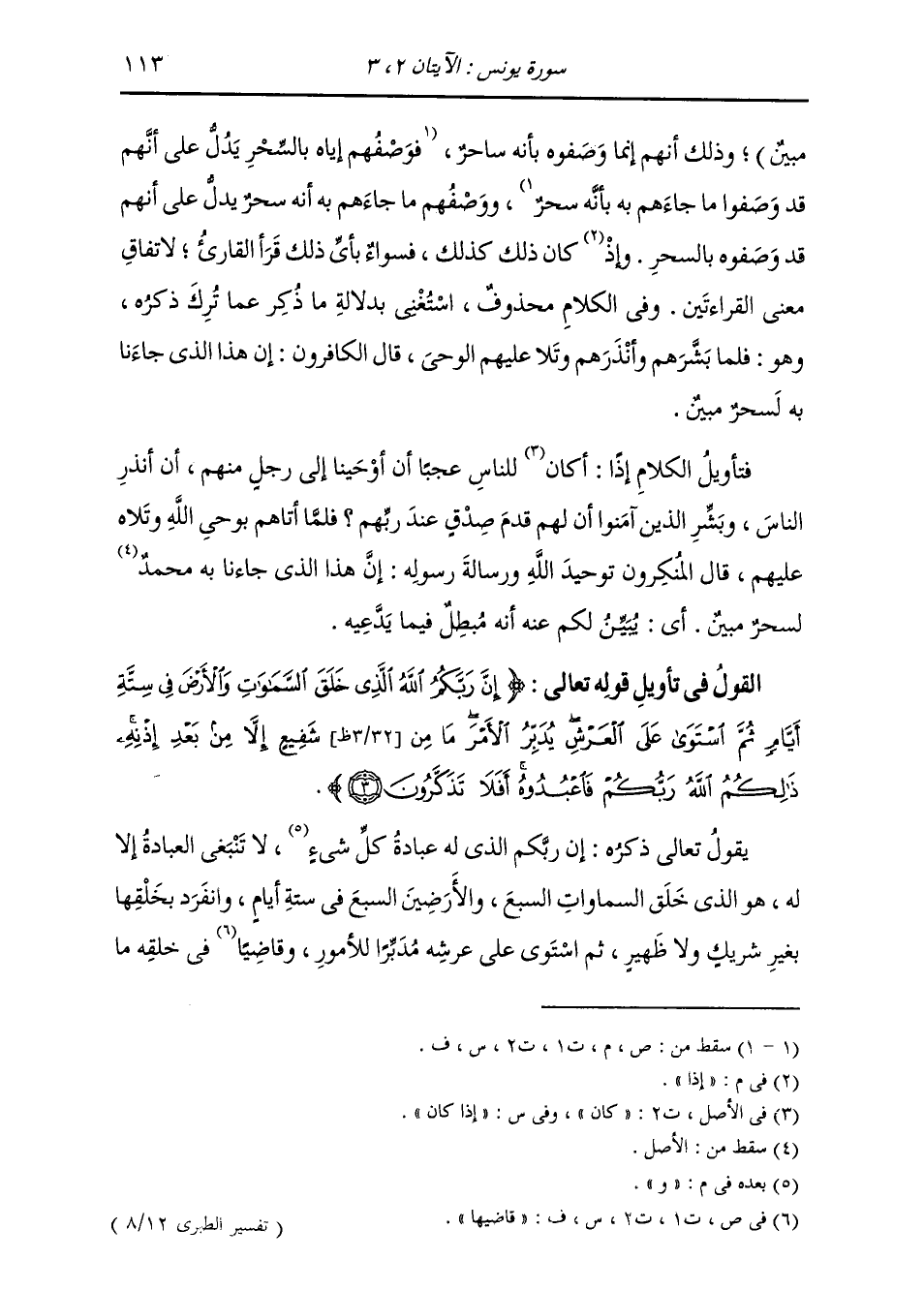 مُبِينٌ» وَذَلِكَ أَنَّهُمْ إِنَّمَا وَصَفُوهُ بِأَنَّهُ سَاحِرٌ، وَوَصْفُهُمْ مَا جَاءَهُمْ بِهِ أَنَّهُ سِحْرٌ يَدُلُّ عَلَى أَنَّهُمْ قَدْ وَصَفُوهُ بِالسِّحْرِ. وَإِذَا كَانَ ذَلِكَ كَذَلِكَ فَسَوَاءٌ بِأَيِّ ذَلِكَ قَرَأَ الْقَارِئُ لِاتِفَاقِ مَعْنَى الْقِرَاءَتَيْنِ وَفِي الْكَلَامِ مَحْذُوفٌ اسْتَغْنَى بِدَلَالَةِ مَا ذَكَرَ عَمَّا تَرَكَ ذِكْرَهُ وَهُوَ: فَلَمَّا بَشَّرَهُمْ وَأَنْذَرَهُمْ وَتَلَا عَلَيْهِمُ الْوَحْيَ، قَالَ الْكَافِرُونَ إِنَّ هَذَا الَّذِي جَاءَنَا بِهِ لَسِحْرٌ مُبِينٌ فَتَأْوِيلُ الْكَلَامِ إِذًا: {أَكَانَ لِلنَّاسِ عَجَبًا أَنْ أَوْحَيْنَا إِلَى رَجُلٍ مِنْهُمْ أَنْ أَنْذِرِ النَّاسَ وَبَشِّرِ الَّذِينَ آمَنُوا أَنَّ لَهُمْ قَدَمَ صِدْقٍ عِنْدَ رَبِّهِمْ} [يونس: 2] ، فَلَمَّا آتَاهُمْ بِوَحْيِ اللَّهِ وَتَلَاهُ عَلَيْهِمْ، قَالَ الْمُنْكِرُونَ تَوْحِيدَ اللَّهِ وَرِسَالَةَ رَسُولِهِ: إِنَّ هَذَا الَّذِي جَاءَنَا بِهِ مُحَمَّدٌ لَسِحْرٌ مُبِينٌ؛ أَيْ يُبَيِّنُ لَكَمْ عَنْهُ أَنَّهُ مُبْطِلٌ فِيمَا يَدَّعِيهِ