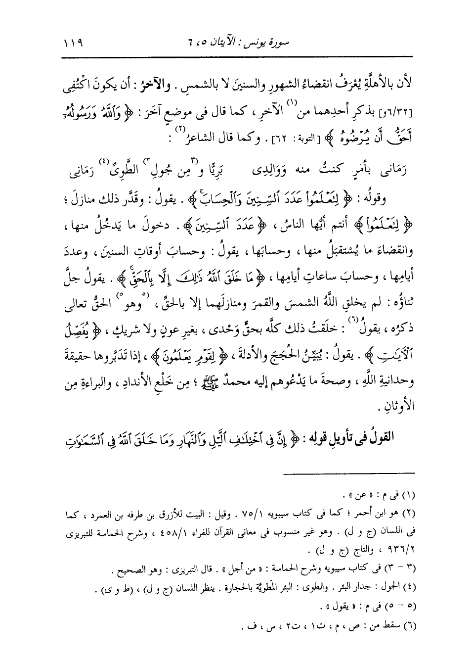 , وَقَوْلُهُ: {لِتَعْلَمُوا عَدَدَ السِّنِينَ وَالْحِسَابَ} [يونس: 5] يَقُولُ: وَقَدَّرَ ذَلِكَ مَنَازِلَ لِتَعْلَمُوا أَنْتُمْ أَيُّهَا النَّاسُ عَدَدَ السِّنِينَ: دُخُولَ مَا يَدْخُلُ مِنْهَا، وَانْقِضَاءَ مَا يُسْتَقْبَلُ مِنْهَا وَحِسَابَهَا، يَقُولُ: وَحِسَابَ أَوْقَاتِ السِّنِينَ وَعَدَدَ أَيَّامِهَا وَحِسَابَ سَاعَاتِ أَيَّامِهَا , {مَا خَلَقَ اللَّهُ ذَلِكَ إِلَّا بِالْحَقِّ} [يونس: 5] يَقُولُ جَلَّ ثَنَاؤُهُ: لَمْ يَخْلُقِ اللَّهُ الشَّمْسَ وَالْقَمَرَ وَمَنَازِلَهُمَا إِلَّا بِالْحَقِّ، يَقُولُ الْحَقُّ تَعَالَى ذِكْرُهُ: خَلَقْتُ ذَلِكَ كُلَّهُ بِحَقٍّ وَحْدِي بِغَيْرِ عَوْنٍ وَلَا شَرِيكٍ. {يُفَصِّلُ الْآيَاتِ} [يونس: 5] يَقُولُ: يُبَيِّنُ الْحُجَجَ وَالْأَدِلَّةَ {لِقَوْمٍ يَعْلَمُونَ} [البقرة: 230] إِذَا تَدَبَّرُوهَا، حَقِيقَةَ وَحْدَانِيَّةَ اللَّهِ، وَصِحَّةَ مَا يَدْعُوهُمْ إِلَيْهِ مُحَمَّدٌ صَلَّى اللهُ عَلَيْهِ وَسَلَّمَ مِنْ خَلْعِ الْأَنْدَادَ وَالْبَرَاءَةَ مِنَ الْأَوْثَانِ