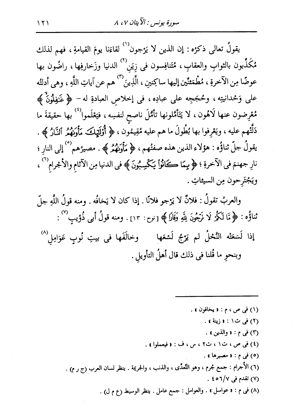 يَقُولُ تَعَالَى ذِكْرُهُ: إِنَّ الَّذِينَ لَا يَخَافُونَ لِقَاءَنَا يَوْمَ الْقِيَامَةِ، فَهُمْ لِذَلِكَ مُكَذِّبُونَ بِالثَّوَابِ وَالْعِقَابِ، مُتَنَافِسُونَ فِي زِيَنِ الدُّنْيَا وَزَخَارِفِهَا، رَاضُونَ بِهَا عِوَضًا مِنَ الْآخِرَةِ، مُطْمَئِنَّيْنَ إِلَيْهَا سَاكِنِينَ {وَالَّذِينَ هُمْ} [الأعراف: 156] عَنْ آيَاتِ اللَّهِ، وَهِيَ أَدِلَّتُهُ عَلَى وَحْدَانِيَّتِهِ، وَحُجَجُهُ عَلَى عِبَادِهِ فِي إِخْلَاصِ الْعِبَادَةِ لَهُ {غَافُلُونَ} [الأنعام: 131] مُعْرِضُونَ عَنْهَا لَاهُوَنَ، لَا يَتَأَمَّلُونَهَا تَأَمُّلَ نَاصِحٍ لِنَفْسِهِ، فَيَعْلَمُوا بِهَا حَقِيقَةَ مَا دَلَّتْهُمْ عَلَيْهِ، وَيَعْرِفُوا بِهَا بُطُولَ مَا هُمْ عَلَيْهِ مُقِيمُونَ. {أُولَئِكَ مَأْوَاهُمُ النَّارُ} [يونس: 8] يَقُولُ جَلَّ ثَنَاؤُهُ: هَؤُلَاءِ الَّذِينَ هَذِهِ صِفَتُهُمْ مَأْوَاهُمْ مَصِيرُهَا إِلَى النَّارِ نَارِ جَهَنَّمَ فِي الْآخِرَةِ. {بِمَا كَانُوا يَكْسِبُونَ} [الأنعام: 129] فِي الدُّنْيَا مِنَ الْآثَامِ وَالْأَجْرَامِ وَيَجْتَرِحُونَ مِنَ السَّيِّئَاتِ وَالْعَرَبُ تَقُولُ: «فُلَانٌ لَا يَرْجُو فُلَانًا» : إِذَا كَانَ لَا يَخَافُهُ. وَمِنْهُ قَوْلُ اللَّهِ جَلَّ ثَنَاؤُهُ: {مَا لَكَمْ لَا تَرْجُونَ لِلَّهِ وَقَارًا} [نوح: 13] . وَمِنْهُ قَوْلُ أَبِي ذُؤَيْبٍ: