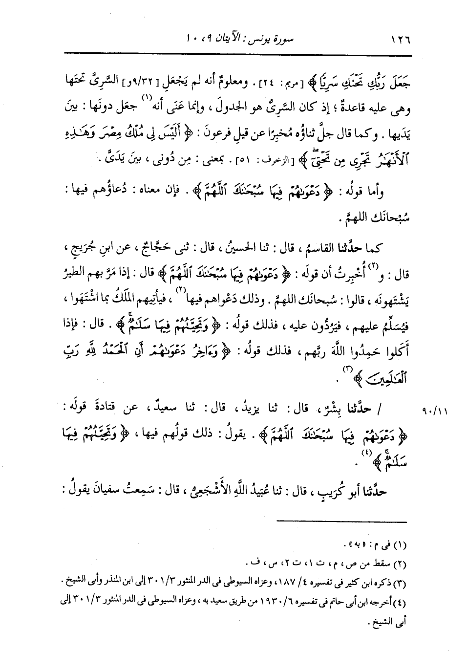 حَدَّثَنَا أَبُو كُرَيْبٍ، قَالَ: ثَنَا عُبَيْدُ اللَّهِ الْأَشْجَعِيُّ، قَالَ: سَمِعْتُ سُفْيَانَ، يَقُولُ -[127]-: " {§دَعْوَاهُمْ فِيهَا سُبْحَانَكَ اللَّهُمَّ وَتَحِيَّتُهُمْ فِيهَا سَلَامٌ} [يونس: 10] قَالَ: إِذَا أَرَادُوا الشَّيْءَ قَالُوا: اللَّهُمَّ فَيَأْتِيهِمْ مَا دَعُوا بِهِ " وَأَمَّا قَوْلُهُ: {سُبْحَانَكَ اللَّهُمَّ} [يونس: 10] فَإِنَّ مَعْنَاهُ: تَنْزِيهًا لَكَ يَا رَبِّ مِمَّا أَضَافَ إِلَيْكَ أَهْلُ الشِّرْكِ بِكَ مِنَ الْكَذِبِ عَلَيْكَ وَالْفُرْيَةِ وَبِنَحْوِ الَّذِي قُلْنَا فِي ذَلِكَ قَالَ أَهْلُ التَّأْوِيلِ. ذِكْرُ مَنْ قَالَ ذَلِكَ