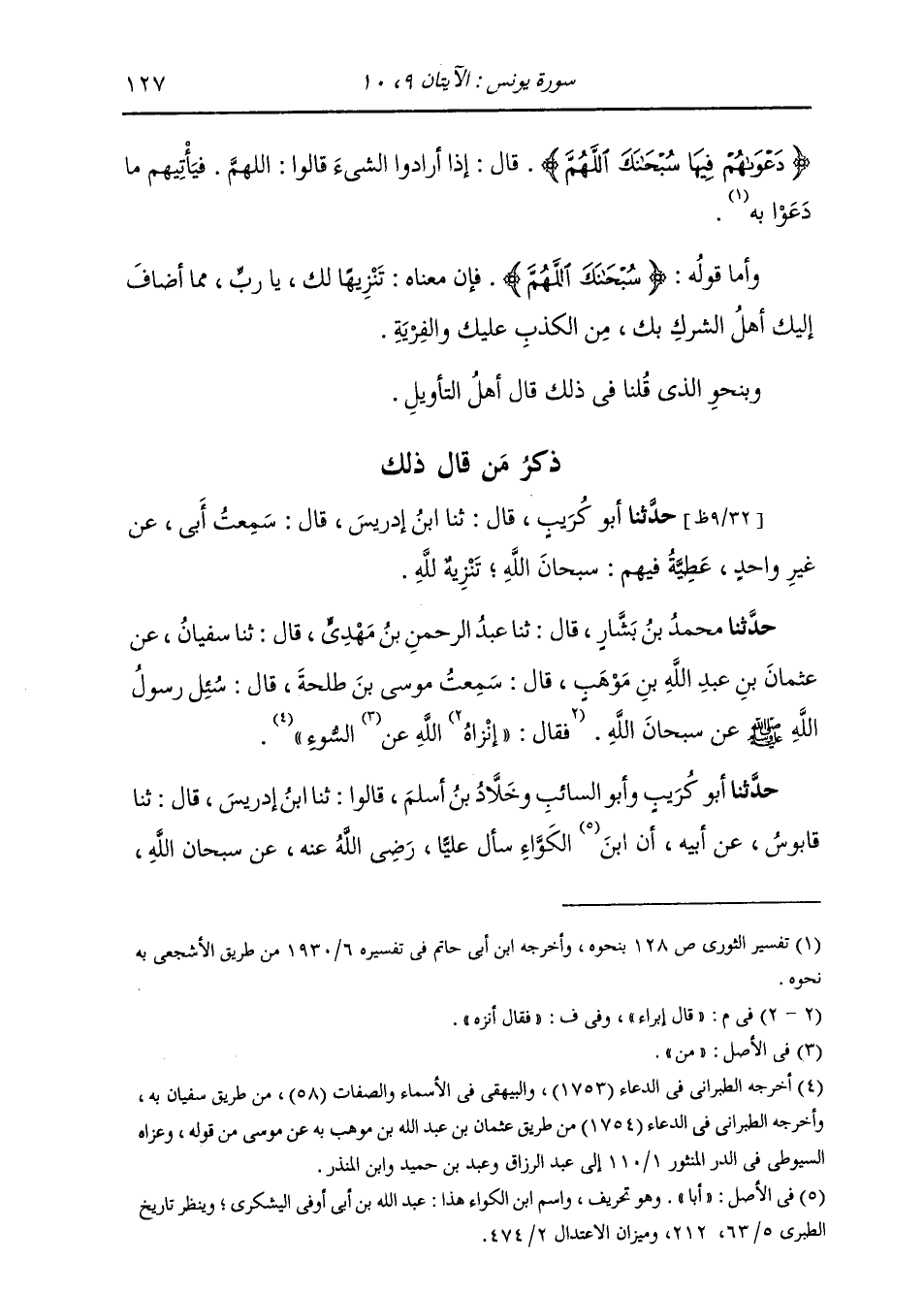 حَدَّثَنَا مُحَمَّدُ بْنُ بَشَّارٍ، قَالَ: ثَنَا عَبْدُ الرَّحْمَنِ بْنُ مَهْدِيٍّ، قَالَ: ثَنَا سُفْيَانُ، عَنْ عُثْمَانَ بْنِ عَبْدِ اللَّهِ بْنِ مَوْهَبٍ، قَالَ: سَمِعْتُ مُوسَى بْنَ طَلْحَةَ، قَالَ: §سُئِلَ رَسُولُ اللَّهِ صَلَّى اللهُ عَلَيْهِ وَسَلَّمَ عَنْ سُبْحَانَ اللَّهِ، قَالَ: «إِبْرَاءُ اللَّهِ عَنِ السُّوءِ»