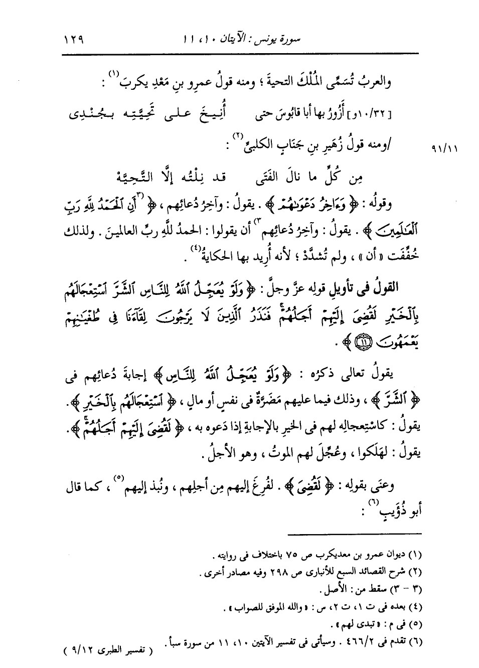 §الْقَوْلُ فِي تَأْوِيلِ قَوْلِهِ تَعَالَى: {وَلَوْ يُعَجِّلُ اللَّهُ لِلنَّاسِ الشَّرَّ اسْتِعْجَالَهُمْ بِالْخَيْرِ لَقُضِيَ إِلَيْهِمْ أَجَلُهُمْ فَنَذَرُ الَّذِينَ لَا يَرْجُونَ لِقَاءَنَا فِي طُغْيَانِهِمْ يَعْمَهُونَ} [يونس: 11] يَقُولُ تَعَالَى ذِكْرُهُ: {وَلَوْ يُعَجِّلُ اللَّهُ لِلنَّاسِ} [يونس: 11] إِجَابَةَ دُعَائِهِمْ فِي {الشَّرِّ} [يونس: 11] وَذَلِكَ فِيمَا عَلَيْهِمْ مَضَرَّةٌ فِي نَفْسٍ أَوْ مَالٍ؛ {اسْتِعْجَالَهُمْ بِالْخَيْرِ} [يونس: 11] يَقُولُ: كَاسْتِعْجَالِهِ لَهُمْ فِي الْخَيْرِ بِالْإِجَابَةِ إِذَا دَعُوهُ بِهِ {لَقُضِيَ إِلَيْهِمْ أَجَلُهُمْ} [يونس: 11] يَقُولُ: لَهَلَكُوا وَعَجَّلَ لَهُمُ الْمَوْتَ، وَهُوَ الْأَجَلُ. وَعَنَى بِقَوْلِهِ: {لَقُضِيَ} [الأنعام: 8] لَفَرَغَ إِلَيْهِمْ مِنْ أَجَلِهِمْ وَتَبَدَّى لَهُمْ، كَمَا قَالَ أَبُو ذُؤَيْبٍ: