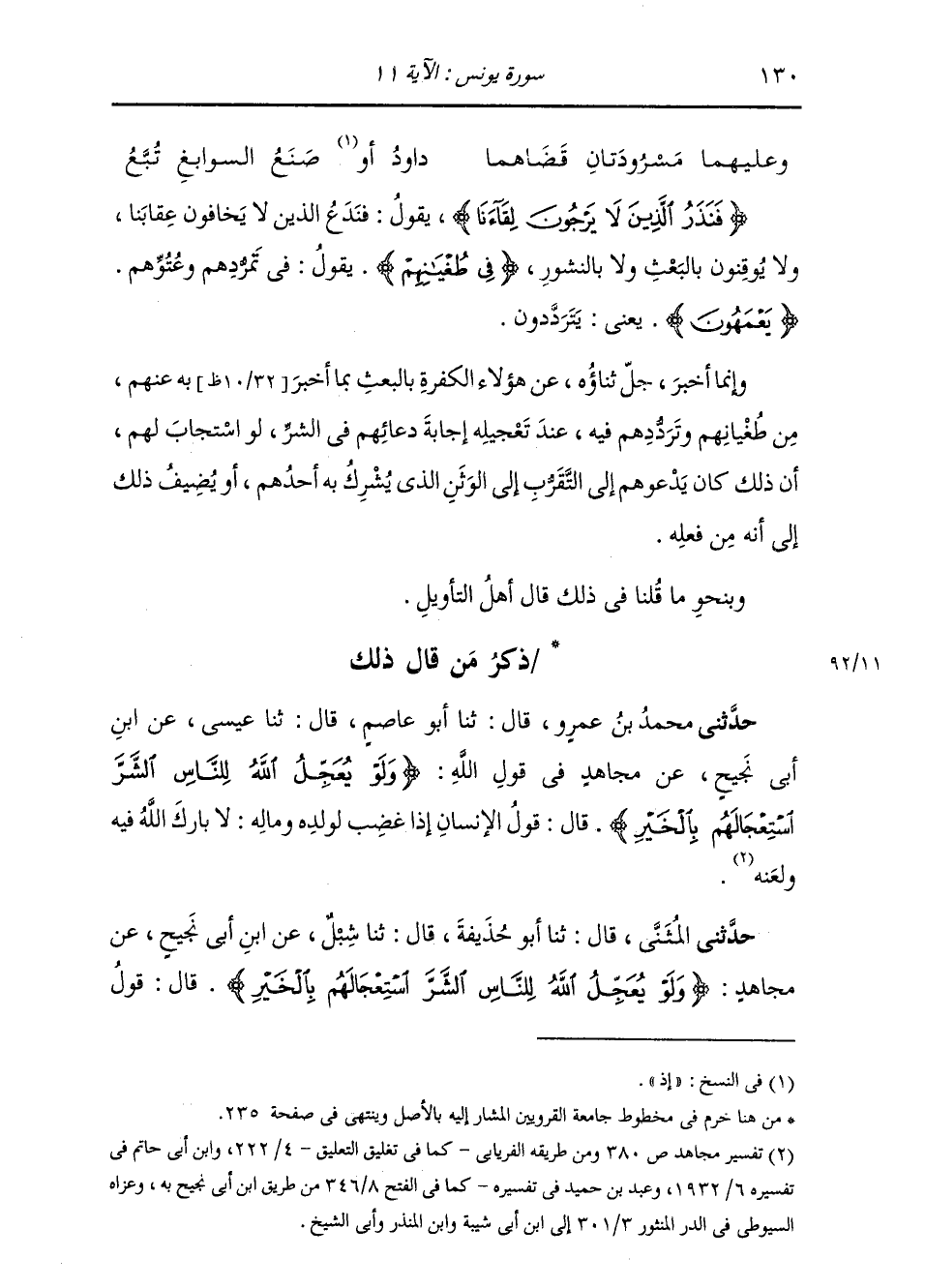 {فَنَذَرُ الَّذِينَ لَا يَرْجُونَ لِقَاءَنَا} [يونس: 11] يَقُولُ: فَنَدَعُ الَّذِينَ لَا يَخَافُونَ عِقَابَنَا وَلَا يُوقِنُونَ بِالْبَعْثِ وَلَا بِالنِّشُورِ، {فِي طُغْيَانِهِمْ} [البقرة: 15] يَقُولُ: فِي تَمَرُّدِهِمْ وَعُتُوِّهِمْ، {يَعْمَهُونَ} [البقرة: 15] يَعْنِي يَتَرَدَّدُونَ وَإِنَّمَا أَخْبَرَ جَلَّ ثَنَاؤُهُ عَنْ هَؤُلَاءِ الْكَفَرَةِ بِالْبَعْثِ بِمَا أَخْبَرَ بِهِ عَنْهُمْ مِنْ طُغْيَانِهِمْ وَتَرَدُّدِهِمْ فِيهِ عِنْدَ تَعْجِيلِهِ إِجَابَةَ دُعَائِهِمْ فِي الشَّرِّ لَوِ اسْتَجَابَ لَهُمْ أَنَّ ذَلِكَ كَانَ يَدْعُوهُمْ إِلَى التَّقَرُّبِ إِلَى الْوَثَنِ الَّذِي يُشْرِكُ بِهِ أَحَدُهُمْ، أَوْ يُضِيفُ ذَلِكَ إِلَى أَنَّهُ مِنْ فَعَلِهِ وَبِنَحْوِ الَّذِي قُلْنَا فِي ذَلِكَ قَالَ أَهْلُ التَّأْوِيلِ ذِكْرُ مَنْ قَالَ ذَلِكَ