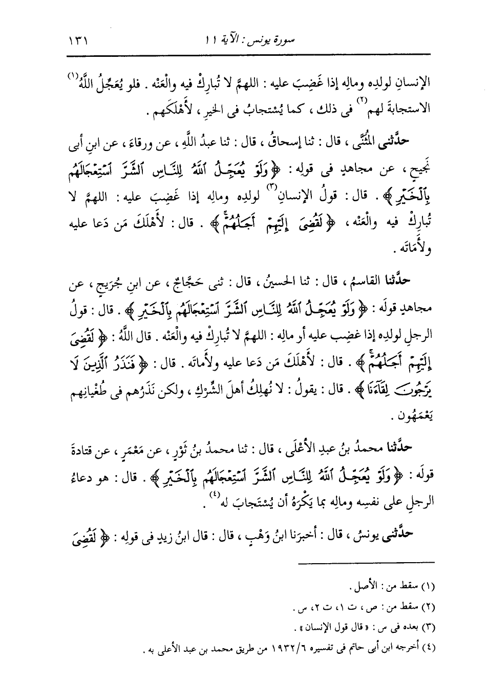 حَدَّثَنَا الْقَاسِمُ، قَالَ: ثَنَا الْحُسَيْنُ، قَالَ: ثَنِي حَجَّاجٌ، عَنِ ابْنِ جُرَيْجٍ، عَنْ مُجَاهِدٍ، قَوْلُهُ: " {§وَلَوْ يُعَجِّلُ اللَّهُ لِلنَّاسِ الشَّرَّ اسْتِعْجَالَهُمْ بِالْخَيْرِ} [يونس: 11] قَالَ: قَوْلُ الرَّجُلِ لِوَلَدِهِ إِذَا غَضِبَ عَلَيْهِ أَوْ مَالِهِ: اللَّهُمَّ لَا تُبَارِكْ فِيهِ وَالْعَنْهُ قَالَ اللَّهُ: {لَقُضِيَ إِلَيْهِمْ أَجَلُهُمْ} [يونس: 11] قَالَ: لَأَهْلَكَ مَنْ دَعَا عَلَيْهِ وَلَأَمَاتَهُ. قَالَ: {فَنَذَرُ الَّذِينَ لَا يَرْجُونَ لِقَاءَنَا} [يونس: 11] قَالَ: يَقُولُ: لَا نُهْلِكُ أَهْلَ الشِّرْكِ، وَلَكَنْ نَذَرْهُمْ فِي طُغْيَانِهِمْ يَعْمَهُونَ "