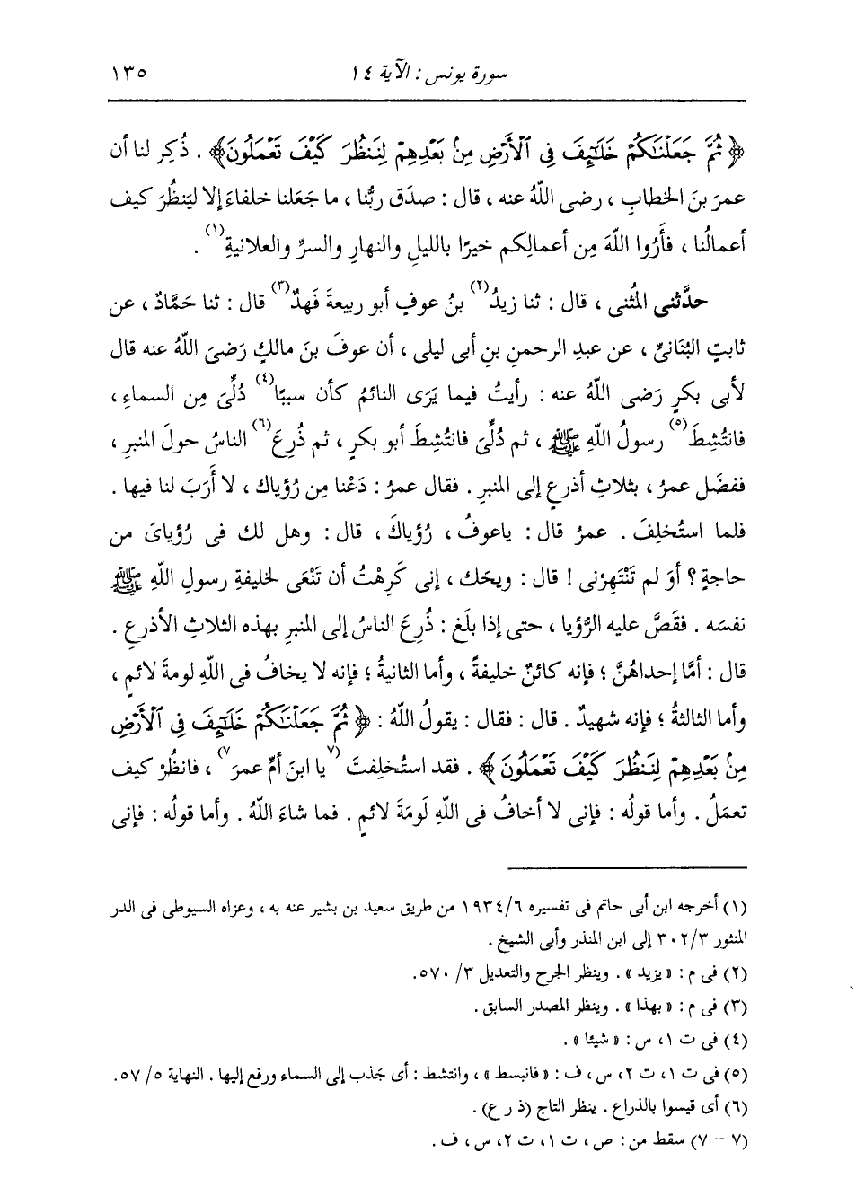 حَدَّثَنِي الْمُثَنَّى، قَالَ: ثَنَا زَيْدُ بْنُ عَوْفِ أَبُو رَبِيعَةَ فَهِدَ قَالَ: ثَنَا حَمَّادٌ، عَنْ ثَابِتِ الْبُنَانِيِّ، عَنْ عَبْدِ الرَّحْمَنِ بْنِ أَبِي لَيْلَى: " أَنَّ عَوْفَ بْنَ مَالِكٍ، رَضِيَ اللَّهُ عَنْهُ قَالَ لِأَبِي بَكْرٍ رَضِيَ اللَّهُ عَنْهُ: §رَأَيْتُ فِيمَا يَرَى النَّائِمُ كَأَنَّ سَبَبًا دُلِّيَ مِنَ السَّمَاءِ فَانْتَشَطَ رَسُولُ اللَّهِ صَلَّى اللهُ عَلَيْهِ وَسَلَّمَ، ثُمَّ دُلِّيَ فَانْتَشَطَ أَبُو بَكْرٍ، ثُمَّ ذَرَعَ النَّاسُ حَوْلَ الْمِنْبَرِ، فَفَضُلَ عُمَرُ رَضِيَ اللَّهُ عَنْهُ بِثَلَاثِ أَذْرُعٍ إِلَى الْمِنْبَرِ فَقَالَ عُمَرُ: دَعْنَا مِنْ رُؤْيَاكَ لَا أَرَبَ لَنَا فِيهَا فَلَمَّا اسْتُخْلِفَ عُمَرُ قَالَ: يَا عَوْفُ رُؤْيَاكَ؟ قَالَ: وَهَلْ لَكَ فِي رُؤْيَايَ مِنْ حَاجَةٍ، أَوْ لَمْ تَنْتَهِرُنِي؟ قَالَ: وَيْحَكَ إِنِّي كَرِهْتُ أَنْ تَنْعِيَ لِخَلِيفَةِ رَسُولِ اللَّهِ صَلَّى اللهُ عَلَيْهِ وَسَلَّمَ نَفْسَهُ فَقَصَّ عَلَيْهِ الرُّؤْيَا، حَتَّى إِذَا بَلْغَ ذَرَعَ النَّاسُ إِلَى الْمِنْبَرِ بِهَذِهِ الثَّلَاثِ الْأَذْرُعِ، قَالَ: أَمَّا إِحْدَاهُنَّ فَإِنَّهُ كَائِنٌ خَلِيفَةً، وَأَمَّا الثَّانِيَةُ فَإِنَّهُ لَا يَخَافُ فِي اللَّهِ لَوْمَةَ لَائِمٍ، وَأَمَّا الثَّالِثَةُ فَإِنَّهُ شَهِيدٌ. قَالَ: فَقَالَ يَقُولُ اللَّهُ: {ثُمَّ جَعَلْنَاكُمْ خَلَائِفَ فِي الْأَرْضِ مِنْ بَعْدِهِمْ لِنَنْظُرَ كَيْفَ تَعْمَلُونَ} [يونس: 14] فَقَدِ اسْتُخْلِفْتَ يَا ابْنَ أُمِّ عُمَرَ، فَانْظُرْ كَيْفَ تَعْمَلُ؛ وَأَمَّا قَوْلُهُ: «فَإِنِّي لَا أَخَافُ فِي اللَّهِ لَوْمَةَ لَائِمٍ» فَمَا شَاءَ اللَّهُ، وَأَمَّا قَوْلُهُ: «فَإِنِّي -[136]- شَهِيدٌ» فَأَنَّى لِعُمَرَ الشَّهَادَةُ وَالْمُسْلِمُونَ مُطِيفُونَ بِهِ ثُمَّ قَالَ «إِنَّ اللَّهَ عَلَى مَا يَشَاءُ قَدْيرٌ»