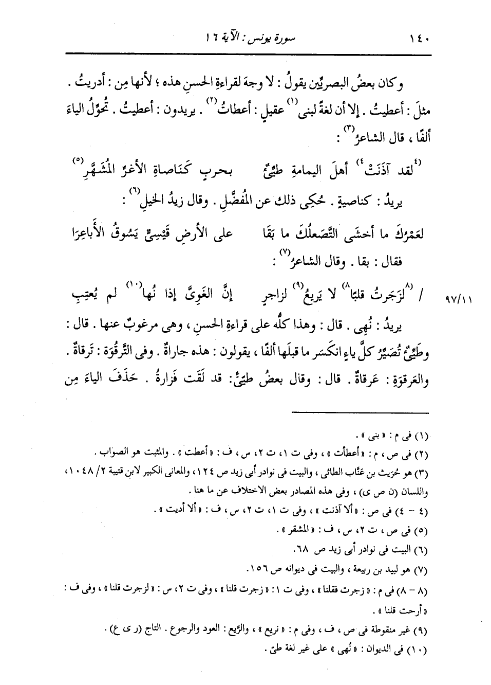 يُرِيدُ «نُهِيَ» قَالَ: وَهَذَا كُلُّهُ عَلَى قِرَاءَةِ الْحَسَنِ، وَهِيَ مَرْغُوبٌ عَنْهَا، قَالَ: وَطَيِّئٌ تُصَيِّرُ كُلَّ يَاءٍ انْكَسَرَ مَا قَبْلَهَا أَلِفًا، يَقُولُونَ: هَذِهِ جَارَاةٌ، وَفِي التَّرْقُوَةِ: تَرْقَاةُ، وَالْعَرْقُوَةِ: عَرْقَاةُ، قَالَ: وَقَالَ بَعْضُ طَيِّئٍ: قَدْ لَقَتْ فَزَارَةُ، حَذَفَ الْيَاءَ مِنْ