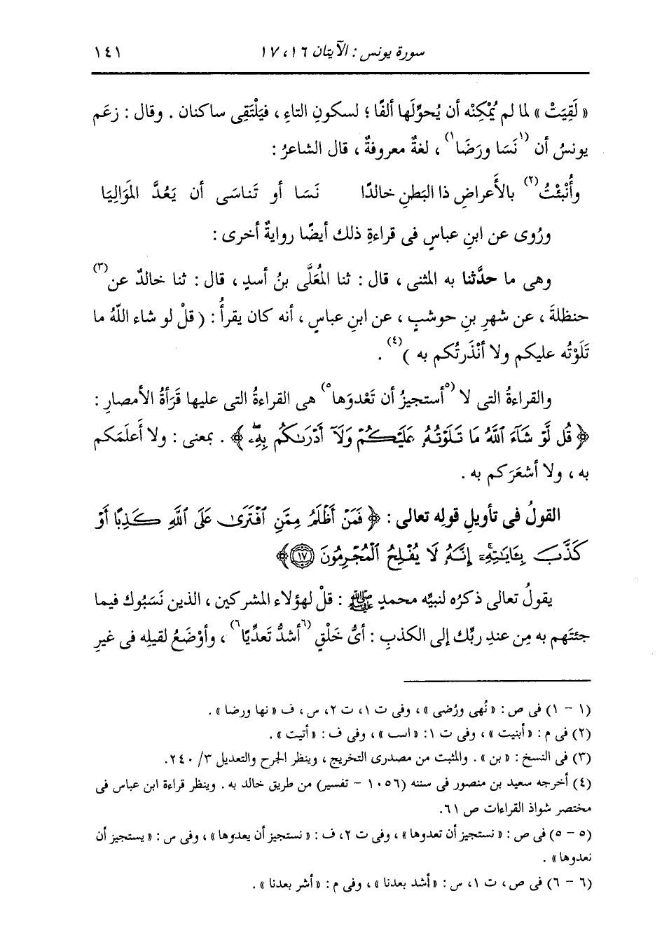 حَدَّثَنَا بِهِ الْمُثَنَّى، قَالَ: ثَنَا الْمُعَلَّى بْنُ أَسَدٍ، قَالَ: ثَنَا خَالِدُ عَنْ حَنْظَلَةَ، عَنْ شَهْرِ بْنِ حَوْشَبٍ، عَنِ ابْنِ عَبَّاسٍ، أَنَّهُ كَانَ يَقْرَأُ: «§قُلْ لَوْ شَاءَ اللَّهُ مَا تَلَوْتُهُ عَلَيْكُمْ وَلَا أَنْذَرْتُكُمْ بِهِ» وَالْقِرَاءَةُ الَّتِي لَا أَسْتَجِيزُ أَنْ تَعُدُّوهَا هِيَ الْقِرَاءَةُ الَّتِي عَلَيْهَا قُرَّاءُ الْأَمْصَارِ: {لَوْ شَاءَ اللَّهُ مَا تَلَوْتُهُ عَلَيْكُمْ وَلَا أَدْرَاكُمْ بِهِ} [يونس: 16] بِمَعْنَى: وَلَا أَعْلَمَكُمْ بِهِ، وَلَا أَشْعَرَكُمْ بِهِ