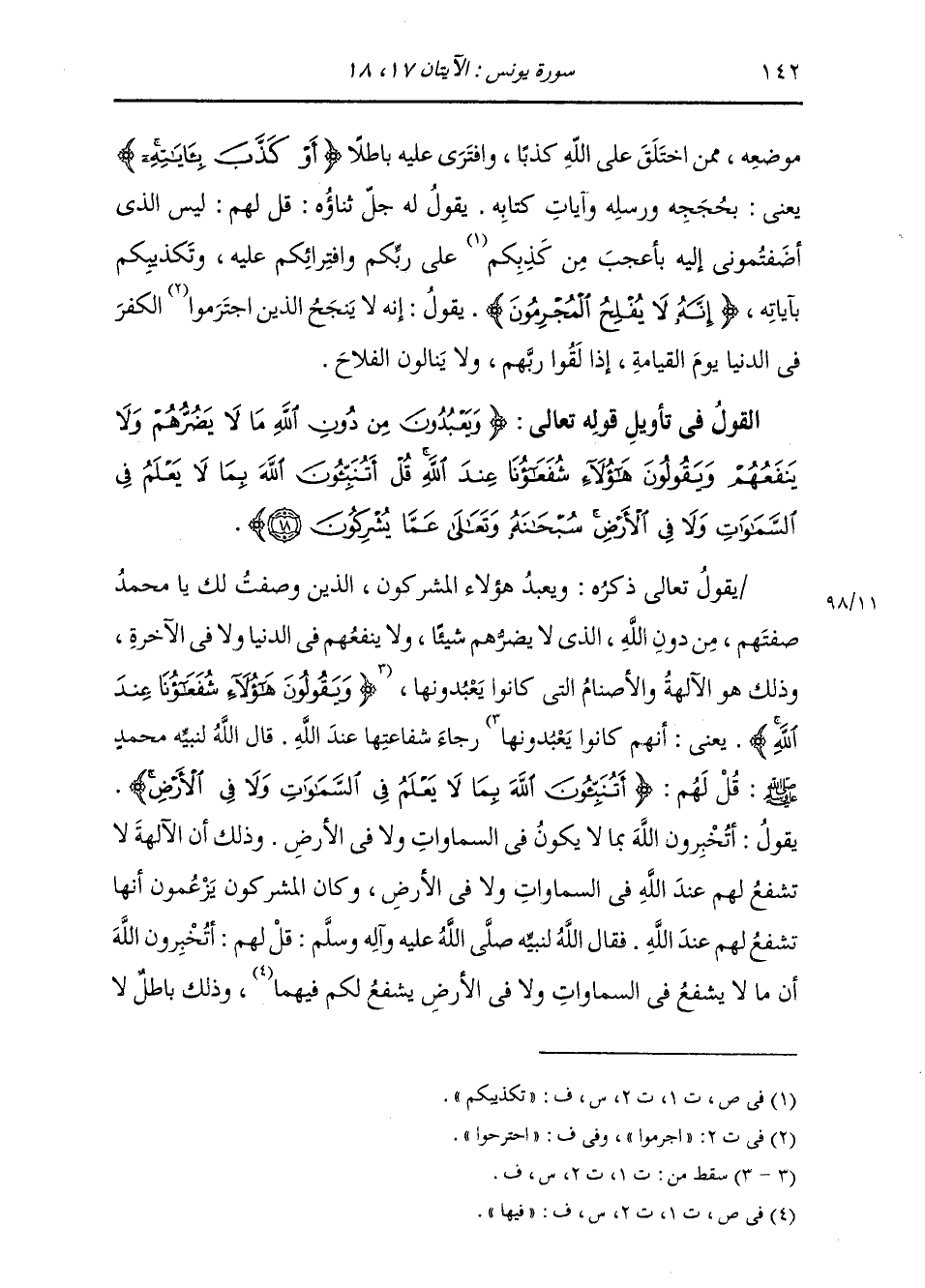 §الْقَوْلُ فِي تَأْوِيلِ قَوْلِهِ تَعَالَى: {وَيَعْبُدُونَ مِنْ دُونِ اللَّهِ مَا لَا يَضُرُّهُمْ وَلَا يَنْفَعُهُمْ وَيَقُولُونَ هَؤُلَاءِ شُفَعَاؤُنَا عِنْدَ اللَّهِ قُلْ أَتُنَبِّئُونَ اللَّهَ بِمَا لَا يَعْلَمُ فِي السَّمَوَاتِ وَلَا فِي الْأَرْضِ سُبْحَانَهُ وَتَعَالَى عَمَّا يُشْرِكُونَ} يَقُولُ تَعَالَى ذِكْرُهُ: وَيَعْبُدُ هَؤُلَاءِ الْمُشْرِكُونَ الَّذِينَ وَصَفْتُ لَكَ يَا مُحَمَّدُ صِفَتَهُمْ مِنْ دُونِ اللَّهِ الَّذِي لَا يَضُرُّهُمْ شَيْئًا وَلَا يَنْفَعُهُمْ فِي الدُّنْيَا وَلَا فِي الْآخِرَةِ، وَذَلِكَ هُوَ الْآلِهَةُ وَالْأَصْنَامُ الَّتِي كَانُوا يَعْبُدُونَهَا. {وَيَقُولُونَ هَؤُلاَءِ شُفَعَاؤُنَا عِنْدَ اللَّهِ} [يونس: 18] يَعْنِي أَنَّهُمْ كَانُوا يَعْبُدُونَهَا رَجَاءَ شَفَاعَتِهَا عِنْدَ اللَّهِ. قَالَ اللَّهُ لِنَبِيِّهِ مُحَمَّدٍ صَلَّى اللهُ عَلَيْهِ وَسَلَّمَ: {قُلْ أَتُنَبِّئُونَ اللَّهَ بِمَا لَا يَعْلَمُ فِي السَّمَوَاتِ وَلَا فِي الْأَرْضِ} يَقُولُ: أَتُخْبِرُونَ اللَّهَ بِمَا لَا يَكُونُ فِي السَّمَاوَاتِ وَلَا فِي الْأَرْضِ؛ وَذَلِكَ أَنَّ الْآلِهَةَ لَا تَشْفَعُ لَهُمْ عِنْدَ اللَّهِ فِي السَّمَاوَاتِ وَلَا فِي الْأَرْضِ. وَكَانَ الْمُشْرِكُونَ يَزْعُمُونَ أَنَّهَا تَشْفَعُ لَهُمْ عِنْدَ اللَّهِ. فَقَالَ اللَّهُ لِنَبِيِّهِ صَلَّى اللهُ عَلَيْهِ وَسَلَّمَ: قُلْ لَهُمْ: أَتُخْبِرُونَ اللَّهَ أَنَّ مَا لَا يَشْفَعُ فِي السَّمَاوَاتِ وَلَا فِي الْأَرْضِ يَشْفَعُ لَكَمْ فِيهِمَا، وَذَلِكَ بَاطِلٌ لَا