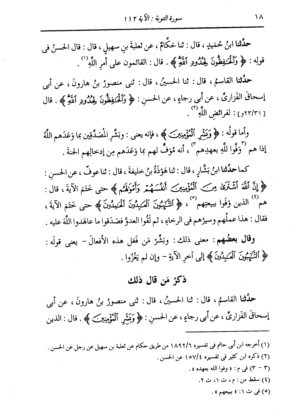 حَدَّثَنَا الْقَاسِمُ، قَالَ: ثَنَا الْحُسَيْنُ، قَالَ: ثَنِي مَنْصُورُ بْنُ هَارُونَ، عَنْ أَبِي إِسْحَاقَ الْفَزَارِيِّ، عَنْ أَبِي رَجَاءٍ، عَنِ الْحَسَنِ، " {§وَالْحَافِظُونَ لِحُدُودِ اللَّهِ} [التوبة: 112] قَالَ: لِفَرَائِضِ اللَّهِ " وَأَمَّا قَوْلُهُ: {وَبَشِّرِ الْمُؤْمِنِينَ} [التوبة: 112] فَإِنَّهُ يَعْنِي: وَبَشِّرِ الْمُصَدِّقِينَ بِمَا وَعَدَهُمُ اللَّهُ إِذَا هُمْ وَفُّوا اللَّهَ بِعَهْدِهِ أَنَّهُ مُوفٍ لَهُمْ بِمَا وَعَدَهُمْ مِنْ إِدْخَالِهِمُ الْجَنَّةَ. كَمَا
