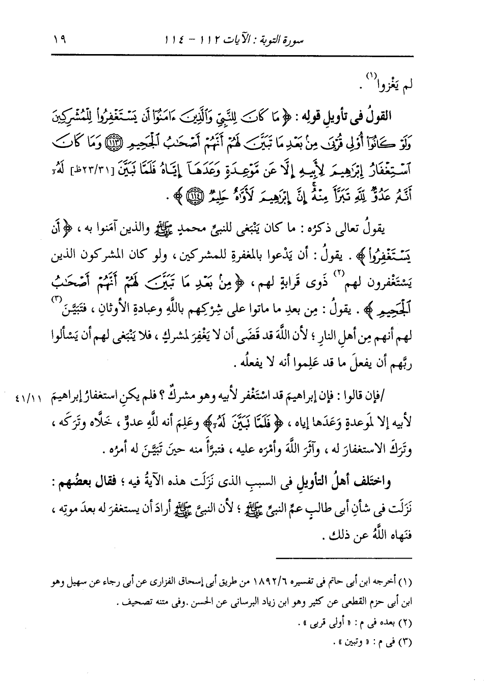 §الْقَوْلُ فِي تَأْوِيلِ قَوْلِهِ تَعَالَى: {مَا كَانَ لِلنَّبِيِّ وَالَّذِينَ آمَنُوا أَنْ يَسْتَغْفِرُوا لِلْمُشْرِكِينَ وَلَوْ كَانُوا أُولِي قُرْبَى مِنْ بَعْدِ مَا تَبَيَّنَ لَهُمْ أَنَّهُمْ أَصْحَابُ الْجَحِيمِ وَمَا كَانَ اسْتِغْفَارُ إِبْرَاهِيمَ لأَبِيهِ إِلاَّ عَن مَّوْعِدَةٍ وَعَدَهَا إِيَّاهُ فَلَمَّا تَبَيَّنَ لَهُ أَنَّهُ عَدُوٌّ للهِ تَبَرَّأَ مِنْهُ إِنَّ إِبْرَاهِيمَ لأوَّاهٌ حَلِيمٌ} [التوبة: 114] يَقُولُ تَعَالَى ذِكْرُهُ: مَا كَانَ يَنْبَغِي لِلنَّبِيِّ مُحَمَّدٍ صَلَّى اللهُ عَلَيْهِ وَسَلَّمَ وَالَّذِينَ آمَنُوا بِهِ أَنْ يَسْتَغْفِرُوا، يَقُولُ: أَنْ يَدْعُوا بِالْمَغْفِرَةِ لِلْمُشْرِكِينَ، وَلَوْ كَانَ الْمُشْرِكُونَ الَّذِينَ يَسْتَغْفِرُونَ لَهُمْ أُولِي قُرْبَى، ذَوِي قَرَابَةٍ لَهُمْ. {مِنْ بَعْدِ مَا تَبَيَّنَ لَهُمْ أَنَّهُمْ أَصْحَابُ الْجَحِيمِ} [التوبة: 113] يَقُولُ: مِنْ بَعْدِ مَا مَاتُوا عَلَى شَرْكِهِمْ بِاللَّهِ وَعِبَادَةِ الْأَوْثَانِ تَبَيَّنَ لَهُمْ أَنَّهُمْ مِنْ أَهْلِ النَّارِ؛ لِأَنَّ اللَّهَ قَدْ قَضَى أَنْ لَا يَغْفِرَ لِمُشْرِكٍ فَلَا يَنْبَغِي لَهُمْ أَنْ يَسْأَلُوا رَبَهُمْ أَنْ يَفْعَلَ مَا قَدْ عَلِمُوا أَنَّهُ لَا يَفْعَلُهُ فَإِنْ قَالُوا: فَإِنَّ إِبْرَاهِيمَ قَدِ اسْتَغْفَرَ لِأَبِيهِ، وَهُوَ مُشْرِكٌ، فَلَمْ يَكُنِ اسْتِغْفَارُ إِبْرَاهِيمَ لِأَبِيهِ إِلَّا لِمَوْعِدَةٍ وَعَدَهَا إِيَّاهُ {فَلَمَّا تَبَيَّنَ لَهُ} [البقرة: 259] وَعَلِمَ أَنَّهُ للَّهِ عَدُوٌّ خَلَّاهُ وَتَرَكَ الِاسْتِغْفَارَ لَهُ، وَآثَرَ اللَّهَ وَأَمْرَهُ عَلَيْهِ، فَتَبَرَّأَ مِنْهُ حِينَ تَبَيَّنَ لَهُ أَمْرُهُ وَاخْتَلَفَ أَهْلُ التَّأْوِيلِ فِي السَّبَبِ الَّذِي نَزَلَتْ هَذِهِ الْآيَةُ فِيهِ، فَقَالَ بَعْضُهُمْ: نَزَلَتْ فِي شَأْنِ أَبِي طَالِبٍ عَمِّ النَّبِيِّ صَلَّى اللهُ عَلَيْهِ وَسَلَّمَ؛ لِأَنَّ النَّبِيَّ صَلَّى اللهُ عَلَيْهِ وَسَلَّمَ أَرَادَ أَنْ يَسْتَغْفِرَ لَهُ بَعْدَ مَوْتِهِ، فَنَهَاهُ اللَّهُ عَنْ ذَلِكَ.