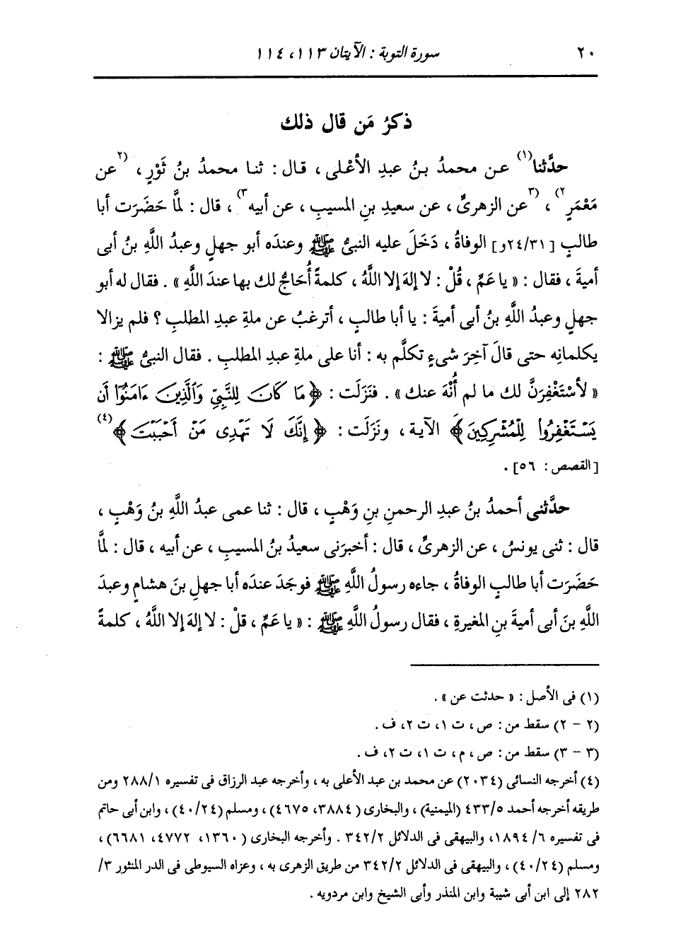 حَدَّثَنَا مُحَمَّدُ بْنُ عَبْدِ الْأَعْلَى، قَالَ: ثَنَا مُحَمَّدُ بْنُ ثَوْرٍ، عَنْ مَعْمَرٍ، قَالَ: لَمَّا حَضَرَتْ أَبَا طَالِبٍ الْوَفَاةُ دَخَلَ عَلَيْهِ النَّبِيُّ صَلَّى اللهُ عَلَيْهِ وَسَلَّمَ وَعِنْدَهُ أَبُو جَهْلٍ، وَعَبْدُ اللَّهِ بْنُ أَبِي أُمَيَّةَ، فَقَالَ: «يَا عَمِّ §قُلْ لَا إِلَهَ إِلَّا اللَّهُ كَلِمَةً أُحَاجُّ لَكَ بِهَا عِنْدَ اللَّهِ» فَقَالَ لَهُ أَبُو جَهْلٍ وَعَبْدُ اللَّهِ بْنُ أَبِي أُمَيَّةَ: يَا أَبَا طَالِبٍ أَتَرْغَبُ عَنْ مِلَّةِ عَبْدِ الْمُطَّلِبِ؟ فَقَالَ النَّبِيُّ صَلَّى اللهُ عَلَيْهِ وَسَلَّمَ: «لَأَسْتَغْفِرَنَّ لَكَ مَا لَمْ أُنْهَ عَنْكَ» فَنَزَلَتْ {مَا كَانَ لِلنَّبِيِّ وَالَّذِينَ آمَنُوا أَنْ يَسْتَغْفِرُوا لِلْمُشْرِكِينَ} [التوبة: 113] ، وَنَزَلَتْ: {إِنَّكَ لَا تَهْدِي مَنْ أَحْبَبْتَ} [القصص: 56] "