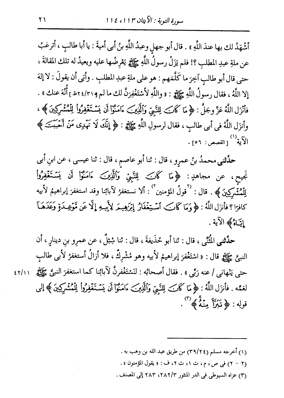 حَدَّثَنِي الْمُثَنَّى، قَالَ: ثَنَا أَبُو حُذَيْفَةَ، قَالَ: ثَنَا شِبْلٌ، عَنْ عَمْرِو بْنِ دِينَارٍ، أَنَّ النَّبِيَّ صَلَّى اللهُ عَلَيْهِ وَسَلَّمَ قَالَ: «§اسْتَغْفَرَ إِبْرَاهِيمُ لِأَبِيهِ وَهُوَ مُشْرِكٌ، فَلَا أَزَالُ أَسْتَغْفِرُ لِأَبِي طَالِبٍ حَتَّى يَنْهَانِي عَنْهُ رَبِّي» فَقَالَ أَصْحَابُهُ: لَنَسْتَغْفِرَنَّ لِآبَائِنَا كَمَا اسْتَغْفَرَ النَّبِيُّ صَلَّى اللهُ عَلَيْهِ وَسَلَّمَ لِعَمِّهِ فَأَنْزَلَ اللَّهُ: {مَا كَانَ لِلنَّبِيِّ وَالَّذِينَ آمَنُوا أَنْ يَسْتَغْفِرُوا لِلْمُشْرِكِينَ} [التوبة: 113] . . إِلَى قَوْلِهِ: {تَبَرَّأَ مِنْهُ} [التوبة: 114] "