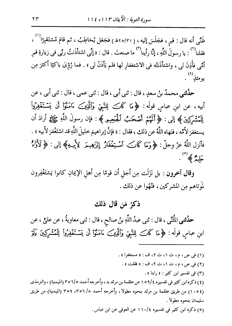 حَدَّثَنِي مُحَمَّدُ بْنُ سَعْدٍ، قَالَ: ثَنِي أَبِي، قَالَ: ثَنِي عَمِّي، قَالَ: ثَنِي أَبِي، عَنْ أَبِيهِ، عَنِ ابْنِ عَبَّاسٍ، قَوْلُهُ: " {§مَا كَانَ لِلنَّبِيِّ وَالَّذِينَ آمَنُوا} [التوبة: 113] . . إِلَى: {أَنَّهُمْ أَصْحَابُ الْجَحِيمِ} [التوبة: 113] أَنَّ رَسُولَ اللَّهِ صَلَّى اللهُ عَلَيْهِ وَسَلَّمَ أَرَادَ أَنْ يَسْتَغْفِرَ لِأُمِّهِ، فَنَهَاهُ عَنْ ذَلِكَ، فَقَالَ: «وَإِنَّ إِبْرَاهِيمَ خَلِيلُ اللَّهِ قَدِ اسْتَغْفِرَ لِأَبِيهِ» فَأَنْزَلَ اللَّهُ: {وَمَا كَانَ اسْتِغْفَارُ إِبْرَاهِيمَ} [التوبة: 114] . . إِلَى: {لَأَوَّاهٌ حَلِيمٌ} [التوبة: 114] " وَقَالَ آخَرُونَ: بَلْ نَزَلَتْ مِنْ أَجْلِ أَنَّ قَوْمًا مِنْ أَهْلِ الْإِيمَانِ كَانُوا يَسْتَغْفِرُونَ لِمَوْتَاهُمْ مِنَ الْمُشْرِكِينَ، فَنُهُوا عَنْ ذَلِكَ. ذِكْرُ مَنْ قَالَ ذَلِكَ
